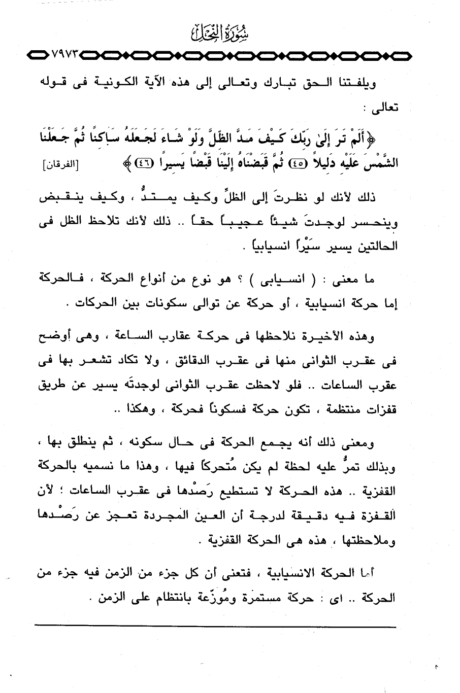 ومعنى ذلك أنه يجمع الحركة في حال سكونه، ثم ينطلق بها، وبذلك تمرُّ عليه لحظة لم يكن مُتحركاً فيها، وهذا ما نسميه بالحركة القفزية. . هذه الحركة لا تستطيع رَصْدها في عقرب الساعات؛ لأن القفزة فيه دقيقة لدرجة أن العين المجردة تعجز عن رَصْدها وملاحظتها، هذه هي الحركة القفزية.
