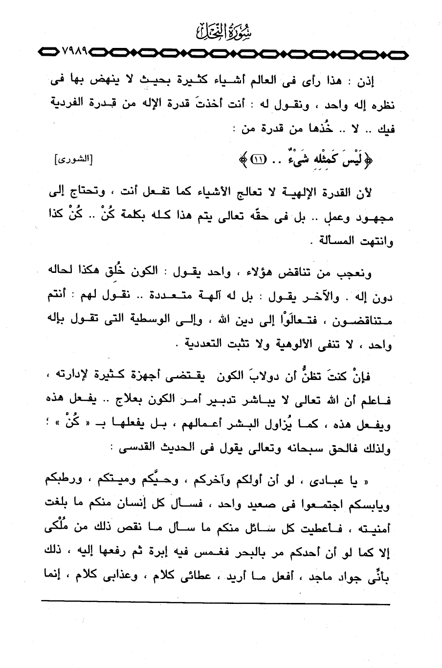فإنْ كنتَ تظنُّ أن دولابَ الكون يقتضي أجهزة كثيرة لإدارته، فاعلم أن الله تعالى لا يباشر تدبير أمر الكون بعلاج. . يفعل هذه ويفعل هذه، كما يُزاول البشر أعمالهم، بل يفعلها ب «كُنْ» ؛ ولذلك فالحق سبحانه وتعالى يقول في الحديث القدسي: «يا عبادي، لو أن أولكم وآخركم، وحيَّكم وميتكم، ورطبكم ويابسكم اجتمعوا في صعيد واحد، فسأل كل إنسان منكم ما بلغت أمنيته، فأعطيت كل سائل منكم ما سأل ما نقص ذلك من مُلْكي إلا كما لو أن أحدكم مر بالبحر فغمس فيه إبرة ثم رفعها إليه، ذلك بأنِّي جواد ماجد، افعل ما أريد، عطائي كلام، وعذابي كلام، إنما