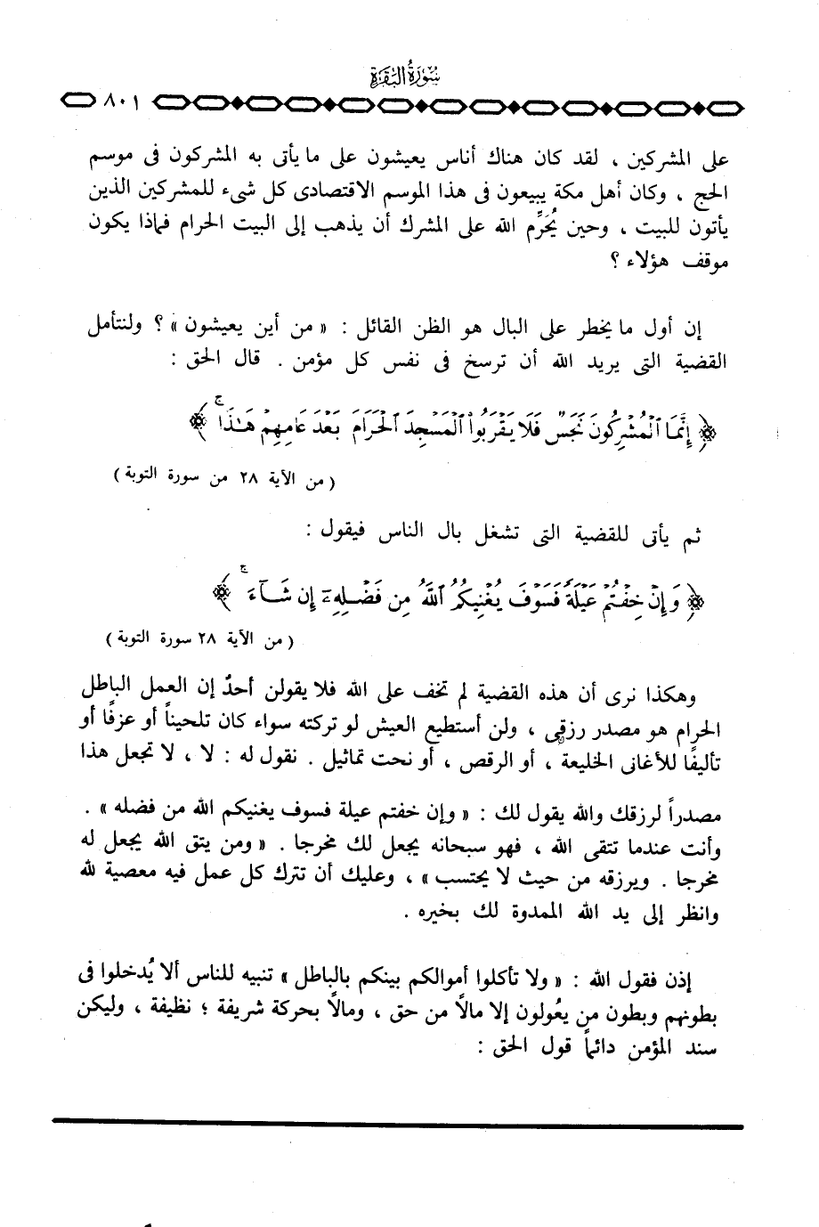 على المشركين، لقد كان هناك أناس يعيشون على ما يأتي به المشركون في موسم الحج، وكان أهل مكة يبيعون في هذا الموسم الاقتصادي كل شيء للمشركين الذين يأتون للبيت، وحين يُحَرِّم الله على المشرك أن يذهب إلى البيت الحرام فماذا يكون موقف هؤلاء؟ إن أول ما يخطر على البال هو الظن القائل: «من أين يعيشون» ؟ ولنتأمل القضية التي يريد الله أن ترسخ في نفس كل مؤمن. قال الحق: {إِنَّمَا المشركون نَجَسٌ فَلاَ يَقْرَبُواْ المسجد الحرام بَعْدَ عَامِهِمْ هذا} [التوبة: 28]