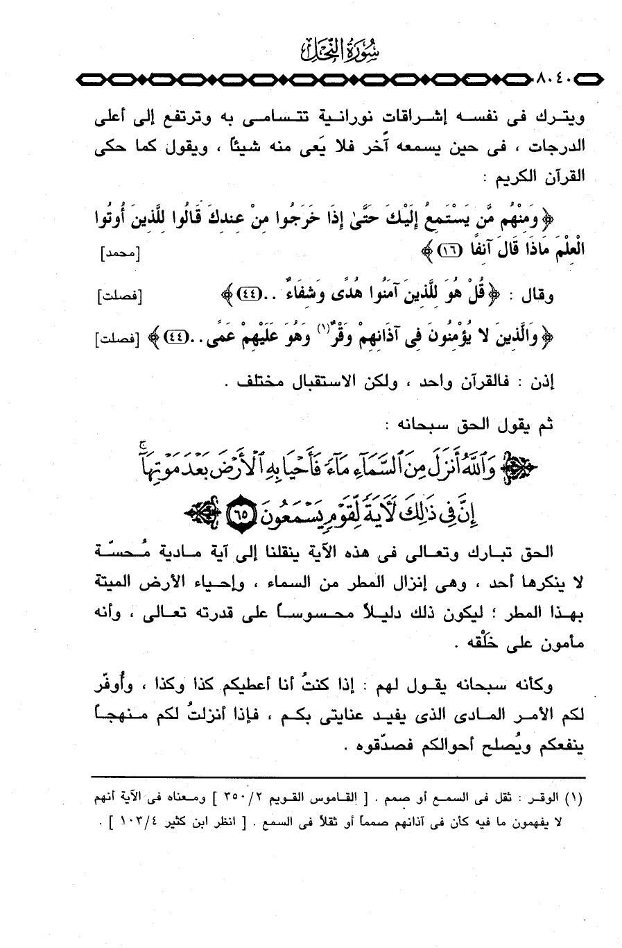 ويترك في نفسه إشراقات نورانية تتسامى به وترتفع إلى أعلى الدرجات، في حين يسمعه آخر فلا يَعي منه شيئاً، ويقول كما حكى القرآن الكريم: {وَمِنْهُمْ مَّن يَسْتَمِعُ إِلَيْكَ حتى إِذَا خَرَجُواْ مِنْ عِندِكَ قَالُواْ لِلَّذِينَ أُوتُواْ العلم مَاذَا قَالَ آنِفاً ... } [محمد: 16] .