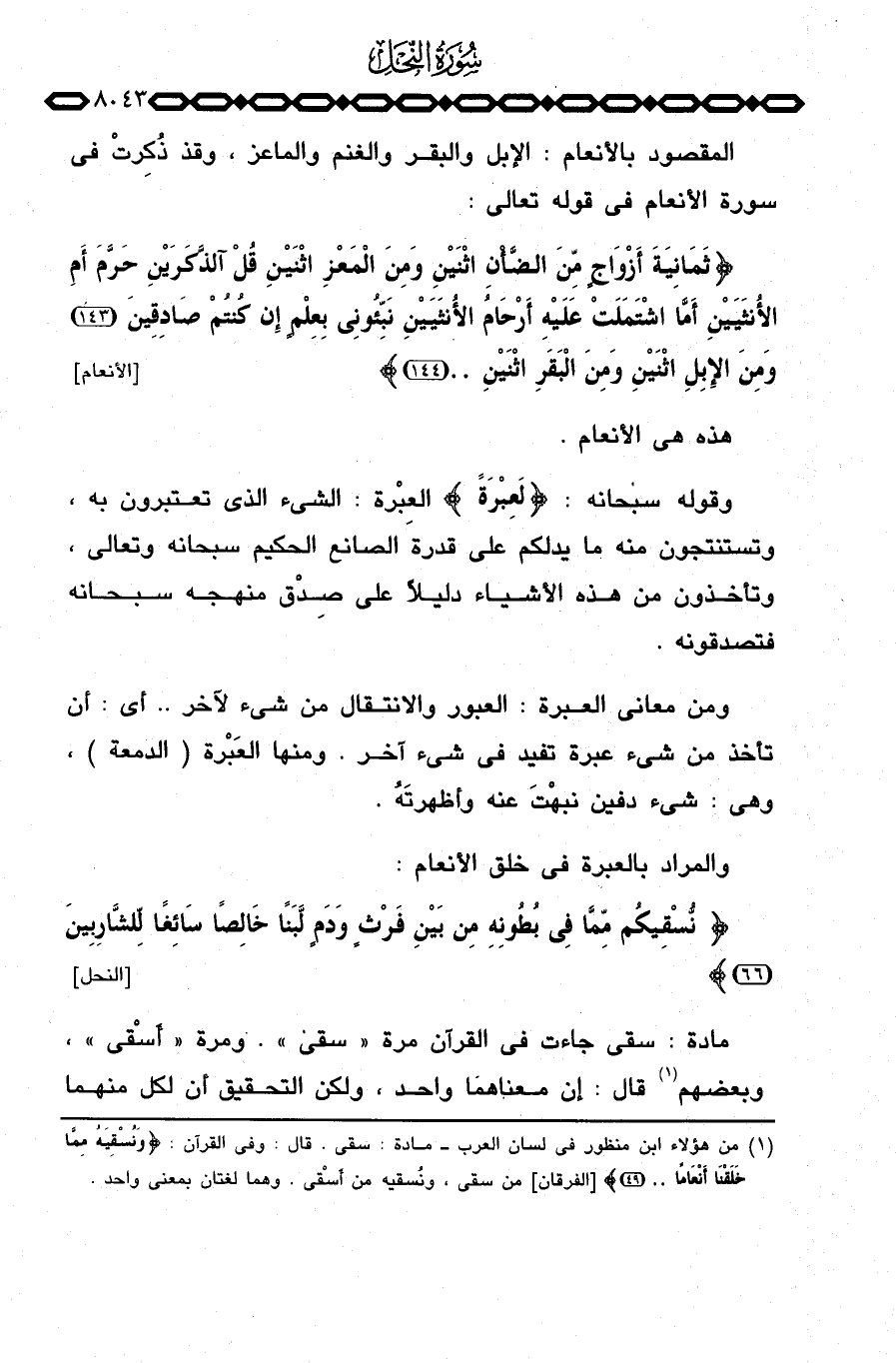 والمقصود بالأنعام: الإبل والبقر والغنم والماعز، وقد ذُكِرتْ في سورة الأنعام في قوله تعالى: {ثَمَانِيَةَ أَزْوَاجٍ مَّنَ الضأن اثنين وَمِنَ المعز اثنين قُلْءَآلذَّكَرَيْنِ حَرَّمَ أَمِ الأنثيين أَمَّا اشتملت عَلَيْهِ أَرْحَامُ الأنثيين نَبِّئُونِي بِعِلْمٍ إِن كُنتُمْ صَادِقِينَ وَمِنَ الإبل اثنين وَمِنَ البقر اثنين ... } [الأنعام: 143 - 144] .