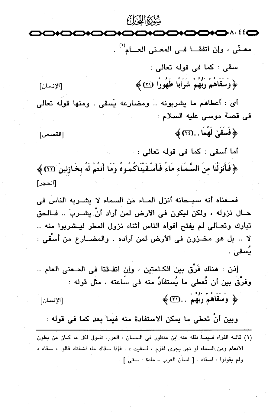 معنًى، وإن اتفقا في المعنى العام. سقى: كما في قوله تعالى: {وَسَقَاهُمْ رَبُّهُمْ شَرَاباً طَهُوراً} [الإنسان: 21] .