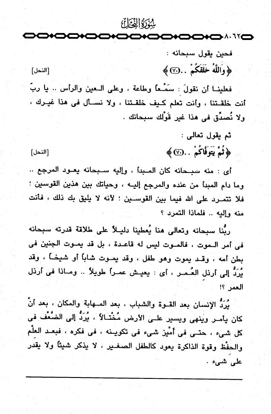 يُرَدُّ الإنسان بعد القوة والشباب، بعد المهابة والمكان، بعد أنْ كان يأمر وينهي ويسير على الأرض مُخْتالاً، يُرَدُّ إلى الضَّعْف في كل شيء، حتى في أَمْيز شيء في تكوينه، في فكره، فبعد العِلْم والحِفْظ وقوة الذاكرة يعود كالطفل الصغير، لا يذكر شيئاً ولا يقدر على شيء.