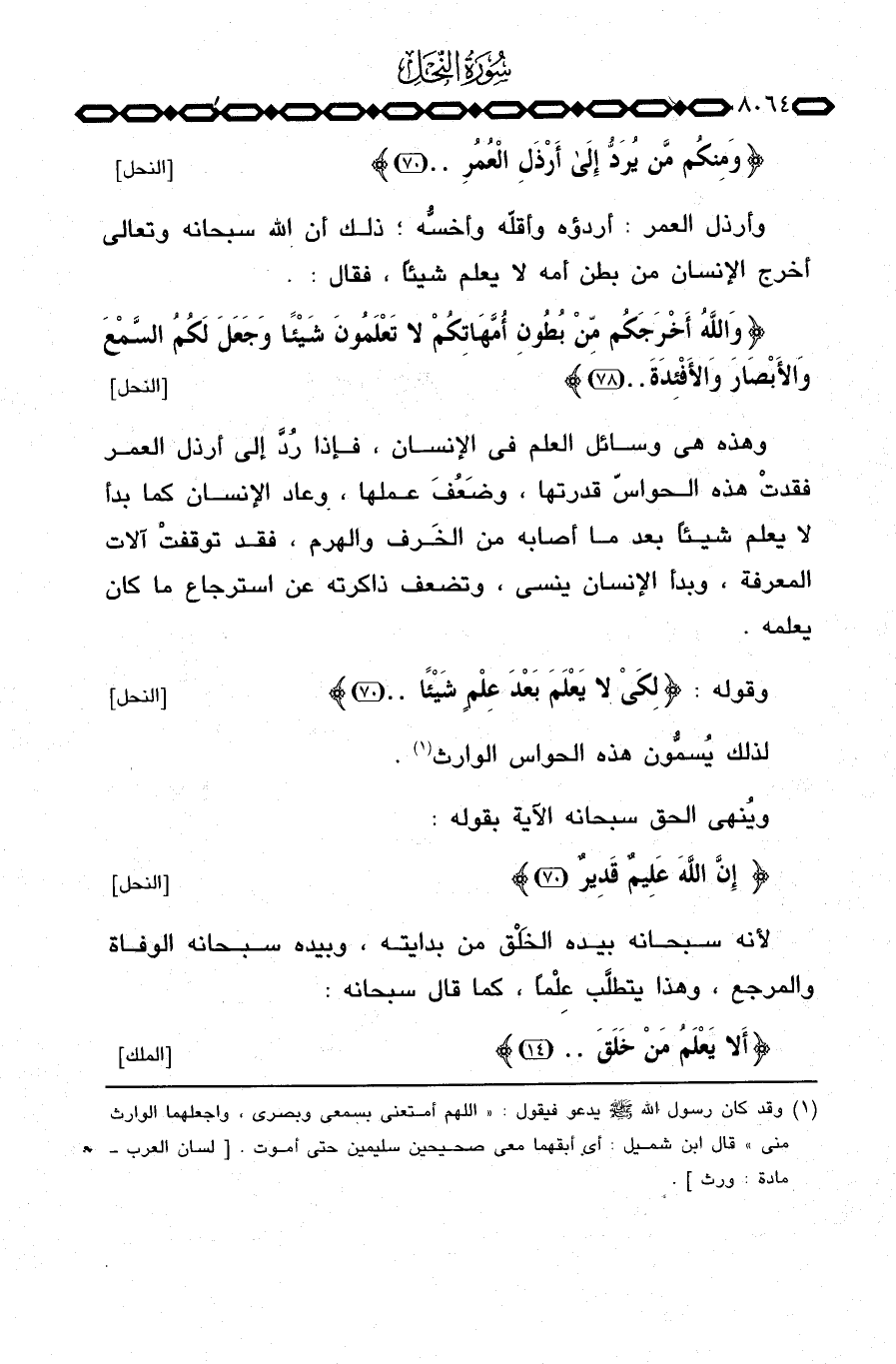 وهذه هي وسائل العلم في الإنسان، فإذا رُدَّ إلى أرذل العمر فقدتْ هذه الحواسّ قدرتها، وضَعُفَ عملها، وعاد الإنسان كما بدأ لا يعلم شيئاً بعد ما أصابه من الخَرف والهرم، فقد توقفتْ آلات المعرفة، وبدأ الإنسان ينسى، وتضعف ذاكرته عن استرجاع ما كان يعلمه.