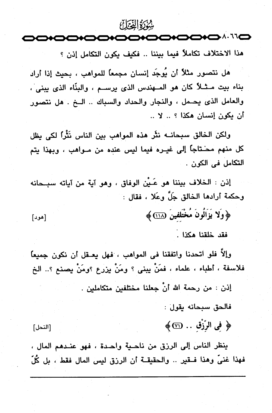 ولكن الخالق سبحانه نثَر هذه المواهب بين الناس نَثْراً لكي يظل كل منهم محتاجاً إلى غيره فيما ليس عنده من مواهب، وبهذا يتم التكامل في الكون.
