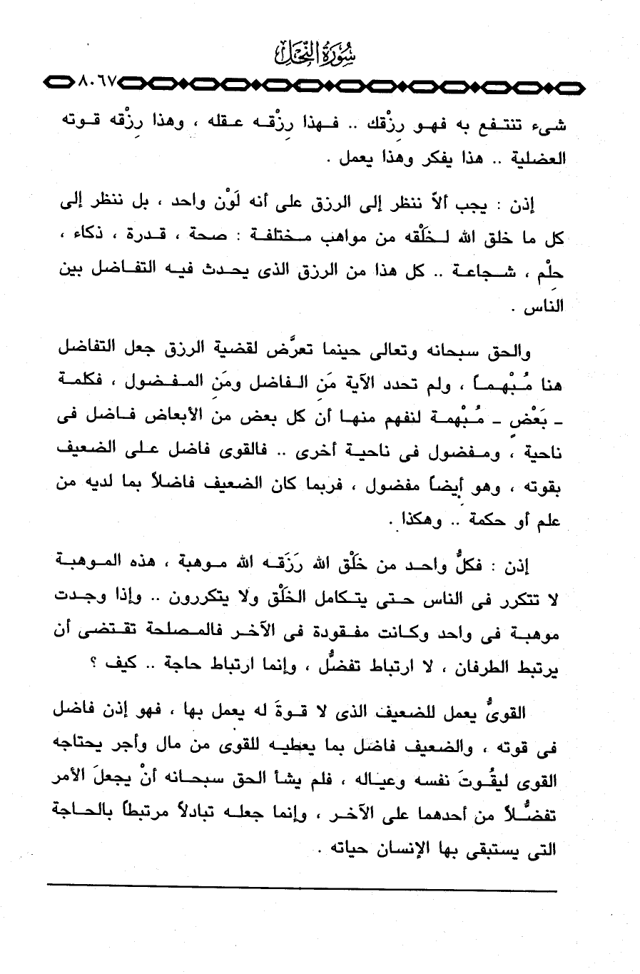 إذن: يجب ألاَّ ننظر إلى الرزق على أنه لَوْن واحد، بل ننظر إلى كل ما خلق الله لخَلْقه من مواهب مختلفة: صحة، قدرة، ذكاء، حِلْم، شجاعة. . كل هذا من الرزق الذي يحدث فيه التفاضل بين الناس.