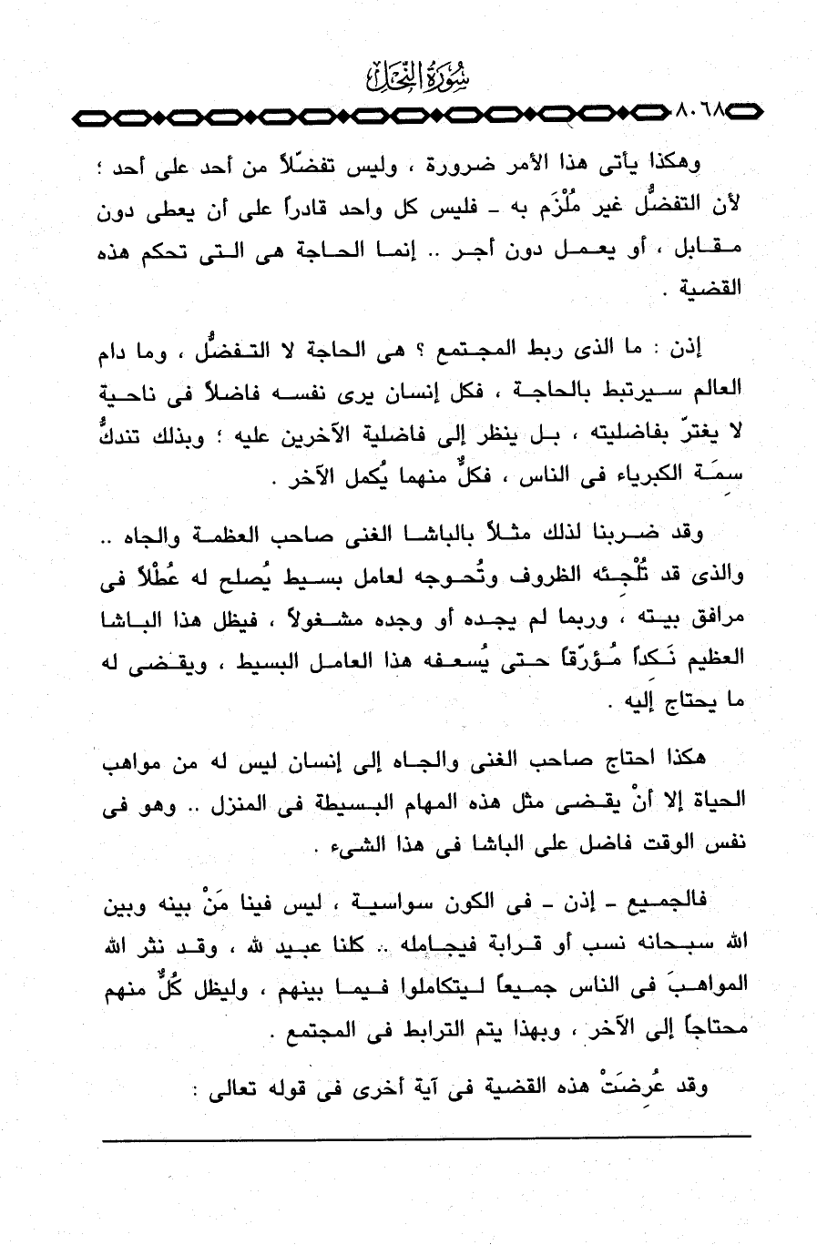 وقد ضربنا لذلك مثلاً بالباشا الغني صاحب العظمة والجاه. . والذي قد تُلْجِئه الظروف وتُحوجه لعامل بسيط يُصلح له عُطْلاً في مرافق بيته، وربما لم يجده أو وجده مشغولاً، فيظل هذا الباشا العظيم نَكِداً مُؤرّقاً حتى يُسعفه هذا العامل البسيط، ويقضي له ما يحتاج إليه.