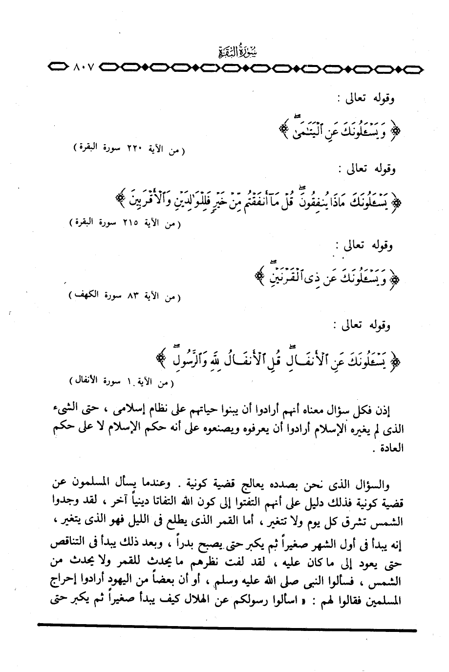 والسؤال الذي نحن بصدده يعالج قضية كونية. وعندما يسأل المسلمون عن قضية كونية فذلك دليل على أنهم التفتوا إلى كون الله التفاتاً دينياً آخر، لقد وجدوا الشمس تشرق كل يوم ولا تتغير، أما القمر الذي يطلع في الليل فهو الذي يتغير، إنه يبدأ في أول الشهر صغيراً ثم يكبر حتى يصبح بدراً، وبعد ذلك يبدأ في التناقص حتى يعود إلى ما كان عليه، لقد لفت نظرهم ما يحدث للقمر ولا يحدث من الشمس، فسألوا النبي صَلَّى اللَّهُ عَلَيْهِ وَسَلَّم َ، أو أن بعضاً من اليهود أرادوا إحراج المسلمين فقالوا لهم: «اسألوا رسولكم عن الهلال كيف يبدأ صغيراً ثم يكبر حتى