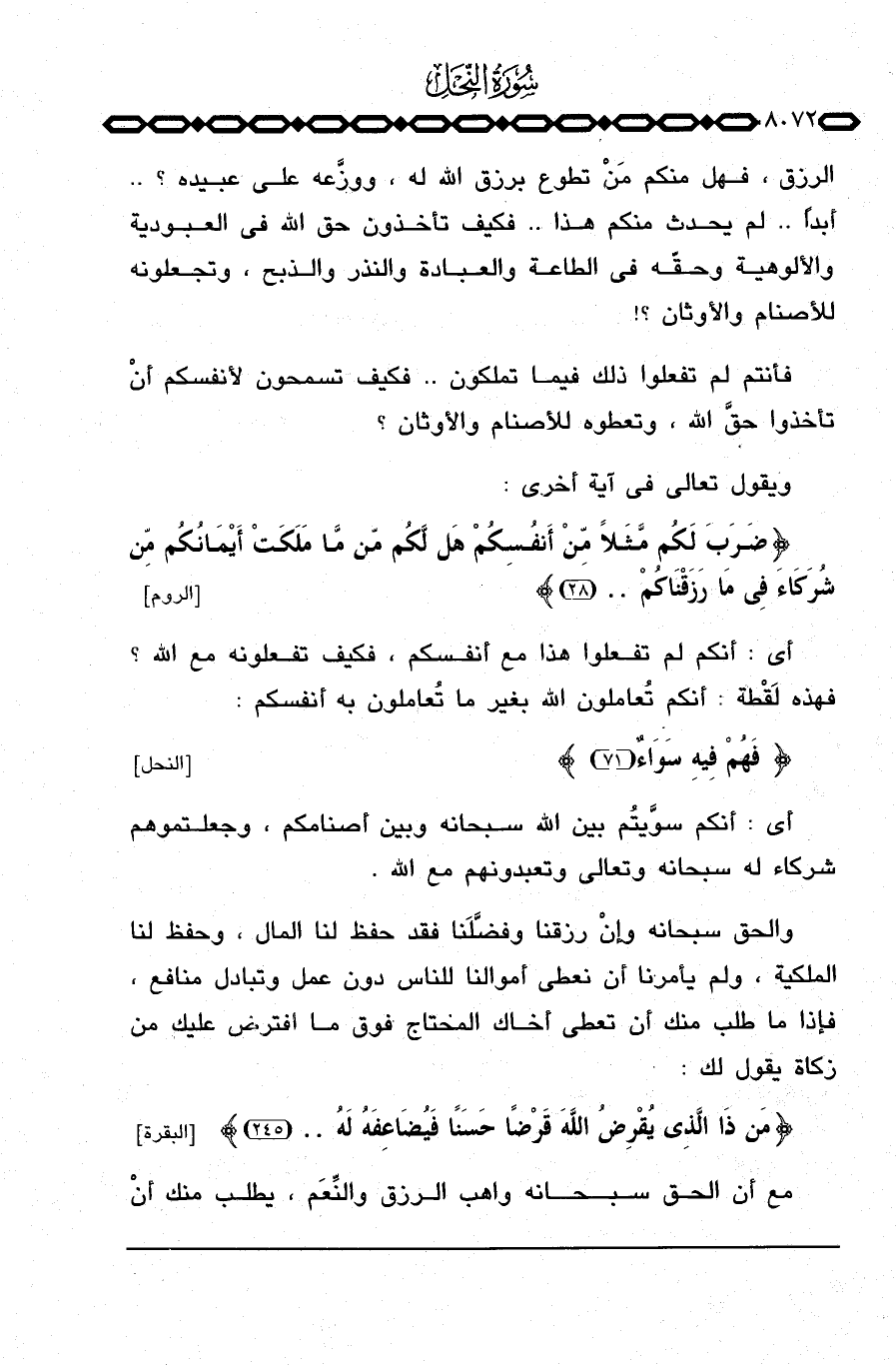 ويقول تعالى في آية أخرى: {ضَرَبَ لَكُمْ مَّثَلاً مِّنْ أَنفُسِكُمْ هَلْ لَّكُمْ مِّن مَّا مَلَكَتْ أَيْمَانُكُمْ مِّن شُرَكَآءَ فِي مَا رَزَقْنَاكُمْ. .} [الروم: 28] .