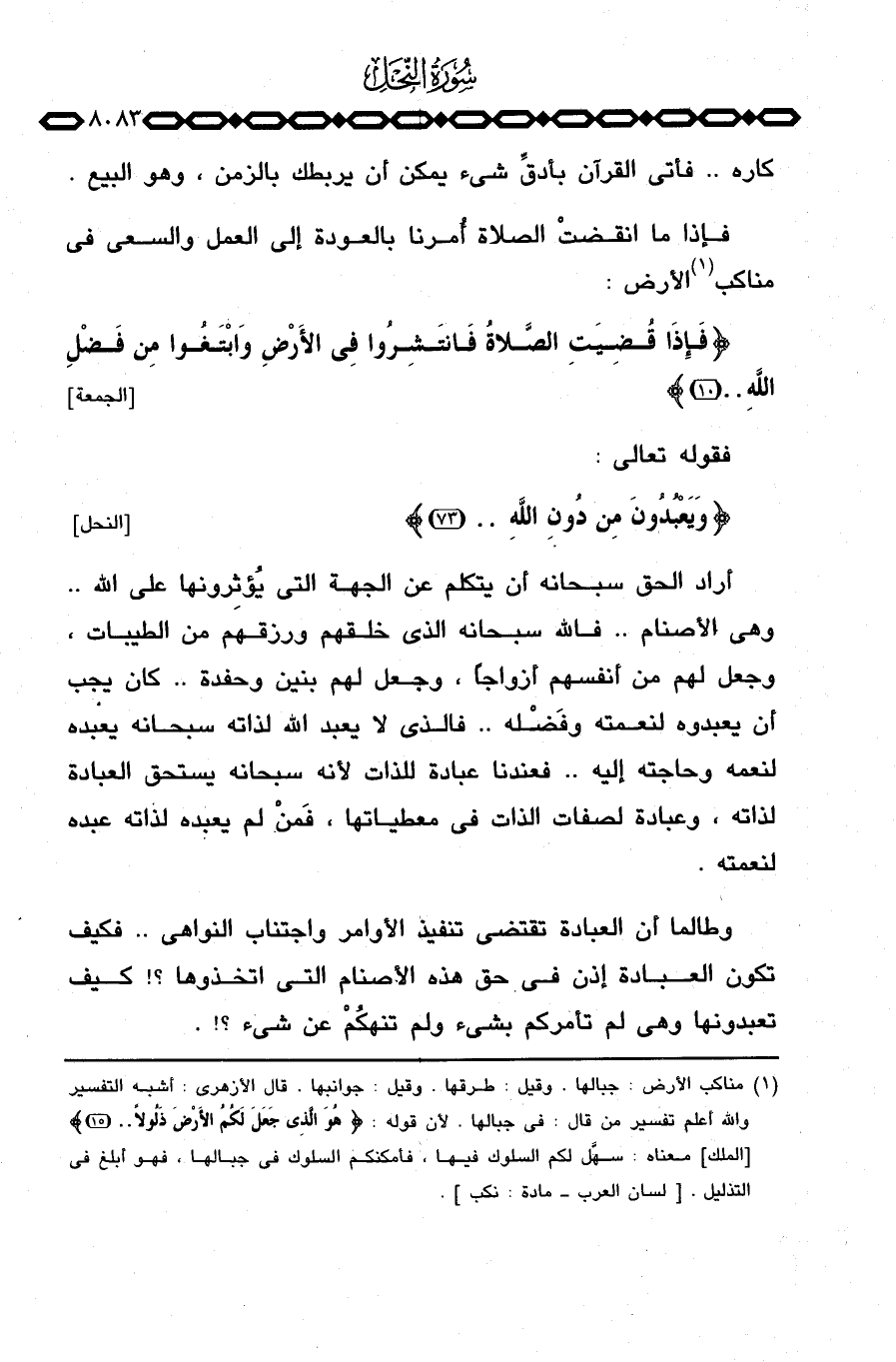 أراد الحق سبحانه أن يتكلم عن الجهة التي يُؤثِرونها على الله. . وهي الأصنام. . فالله سبحانه الذي خلقهم ورزقهم من الطيبات، وجعل لهم من أنفسهم أزواجاً، وجعل لهم بنين وحفدة. . كان يجب أن يعبدوه لنعمته وفَضْله. . فالذي لا يعبد الله لذاته سبحانه يعبده لنعمه وحاجته إليه. . فعندنا عبادة للذات لأنه سبحانه يستحق العبادة لذاته، وعبادة لصفات الذات في معطياتها، فمَنْ لم يعبده لذاته عبده لنعمته.