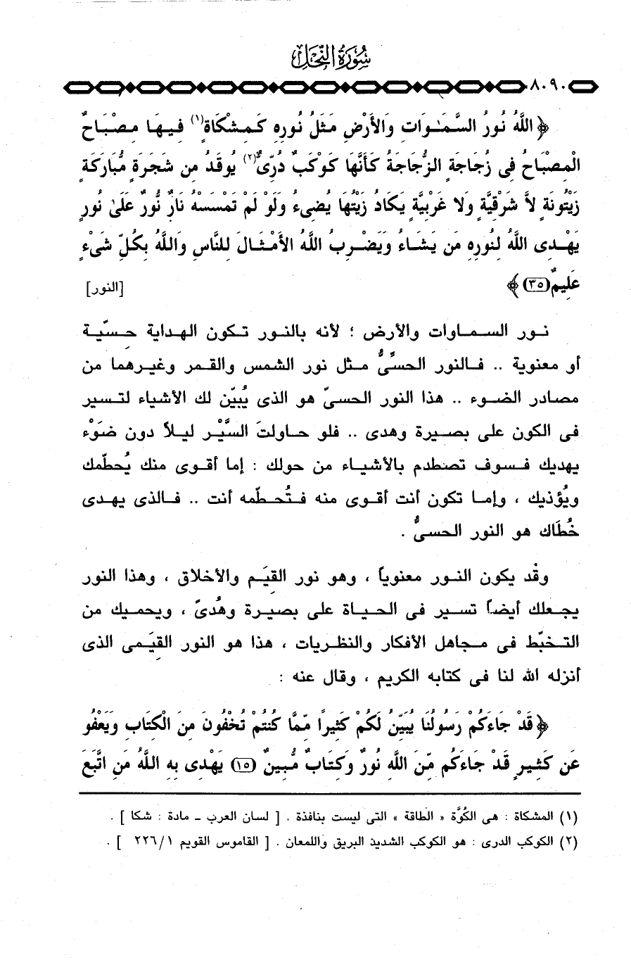 {الله نُورُ السماوات والأرض مَثَلُ نُورِهِ كَمِشْكَاةٍ فِيهَا مِصْبَاحٌ المصباح فِي زُجَاجَةٍ الزجاجة كَأَنَّهَا كَوْكَبٌ دُرِّيٌّ يُوقَدُ مِن شَجَرَةٍ مُّبَارَكَةٍ زَيْتُونَةٍ لاَّ شَرْقِيَّةٍ وَلاَ غَرْبِيَّةٍ يَكَادُ زَيْتُهَا يضياء وَلَوْ لَمْ تَمْسَسْهُ نَارٌ نُّورٌ على نُورٍ يَهْدِي الله لِنُورِهِ مَن يَشَآءُ وَيَضْرِبُ الله الأمثال لِلنَّاسِ والله بِكُلِّ شَيْءٍ عَلَيِمٌ} [النور: 35] .
