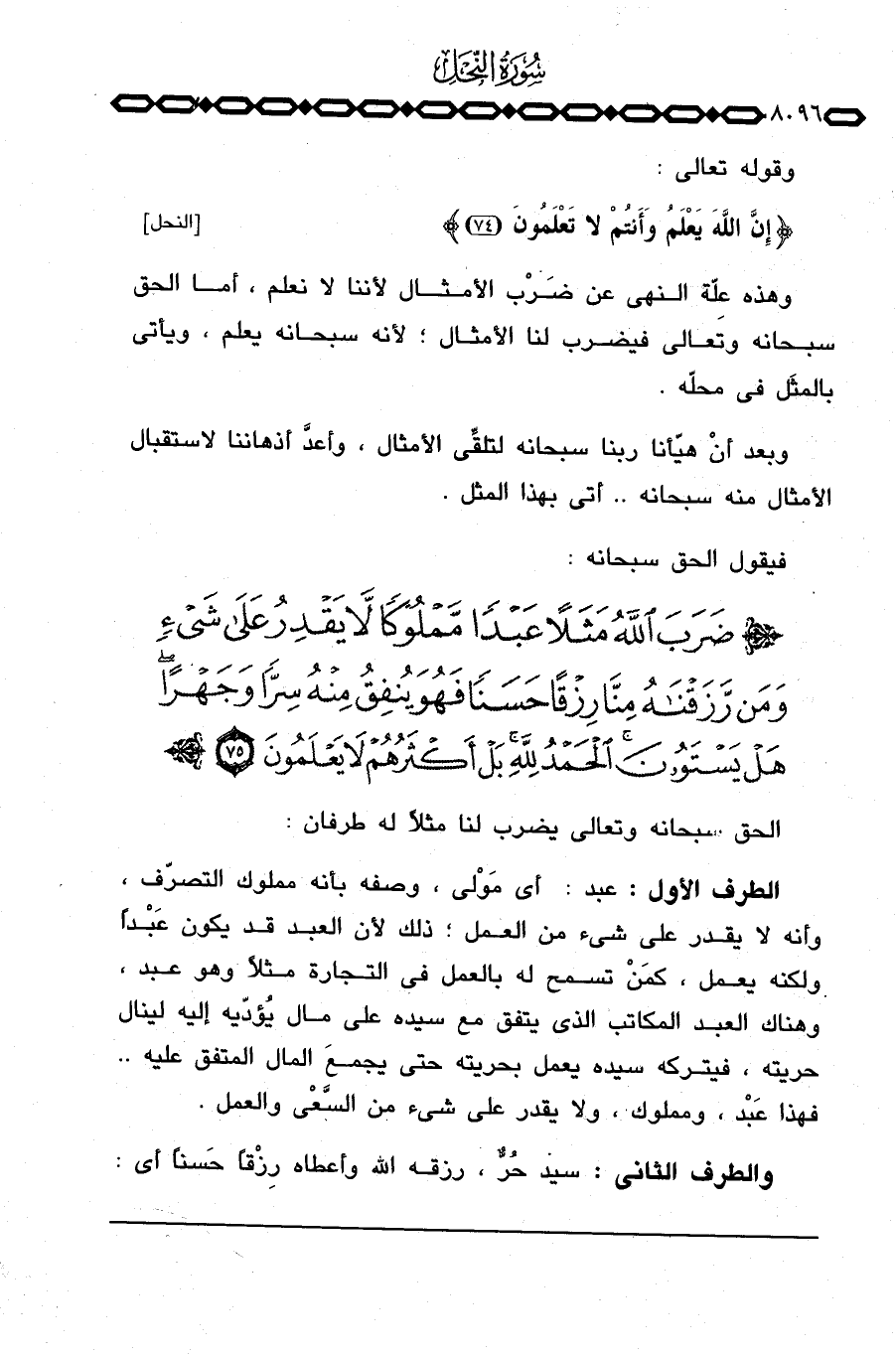 الطرف الأول: عبد: أي مَوْلى، وصفه بأنه مملوك التصرّف، وأنه لا يقدر على شيء من العمل؛ ذلك لأن العبد قد يكون عَبْداً ولكنه يعمل، كمَنْ تسمح له بالعمل في التجارة مثلاً وهو عبد، وهناك العبد المكاتب الذي يتفق مع سيده على مال يُؤدّيه إليه لينال حريته، فيتركه سيده يعمل بحريته حتى يجمعَ المال المتفق عليه. . فهذا عَبْد، ومملوك، ولا يقدر على شيء من السَّعْي والعمل.