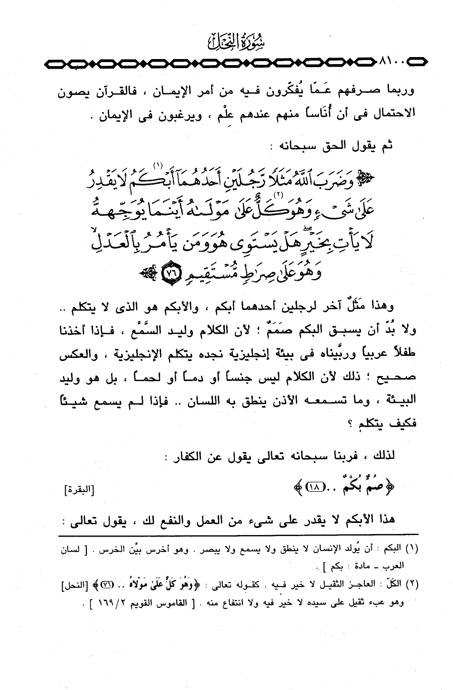 وهذا مَثَلٌ آخر لرجلين أحدهما أبكم، والأبكم هو الذي لا يتكلم. . ولا بُدّ أن يسبق البكم صَمَمٌ؛ لأن الكلام وليد السَّمْع، فإذا أخذنا طفلاً عربياً وربَّيناه في بيئة إنجليزية نجده يتكلم الإنجليزية، والعكس صحيح؛ ذلك لأن الكلام ليس جنساً أو دماً أو لحماً، بل هو وليد البيئة، وما تسمعه الأذن ينطق به اللسان. . فإذا لم يسمع شيئاً فكيف يتكلم؟