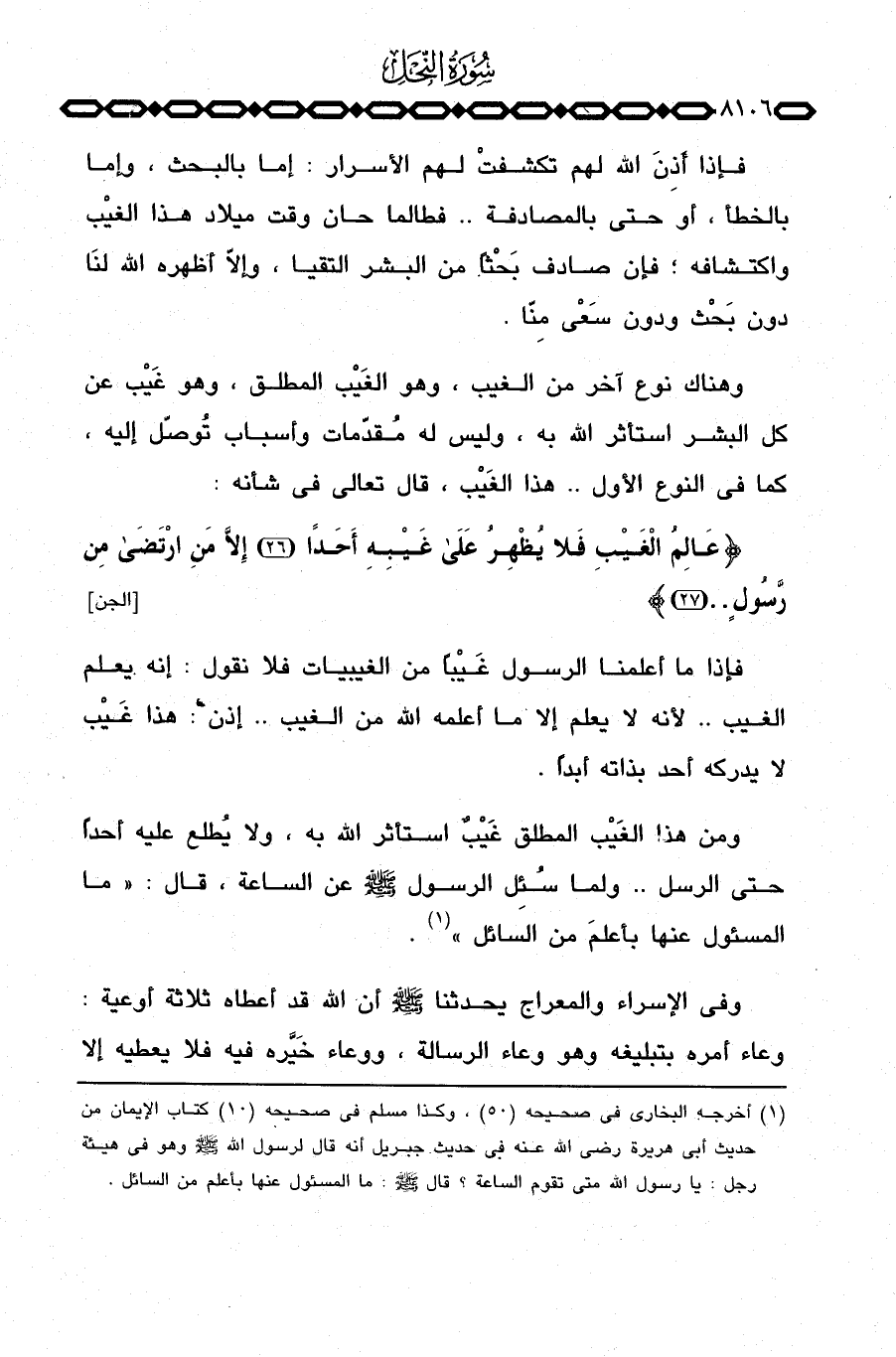 ومن هذا الغَيْب المطلق غَيْبٌ استأثر الله به، ولا يُطلع عليه أحداً حتى الرسل. . «ولما سُئِل الرسول صَلَّى اللَّهُ عَلَيْهِ وَسَلَّم َ عن الساعة، قال:» ما المسئول عنها بأعلم من السائل «.