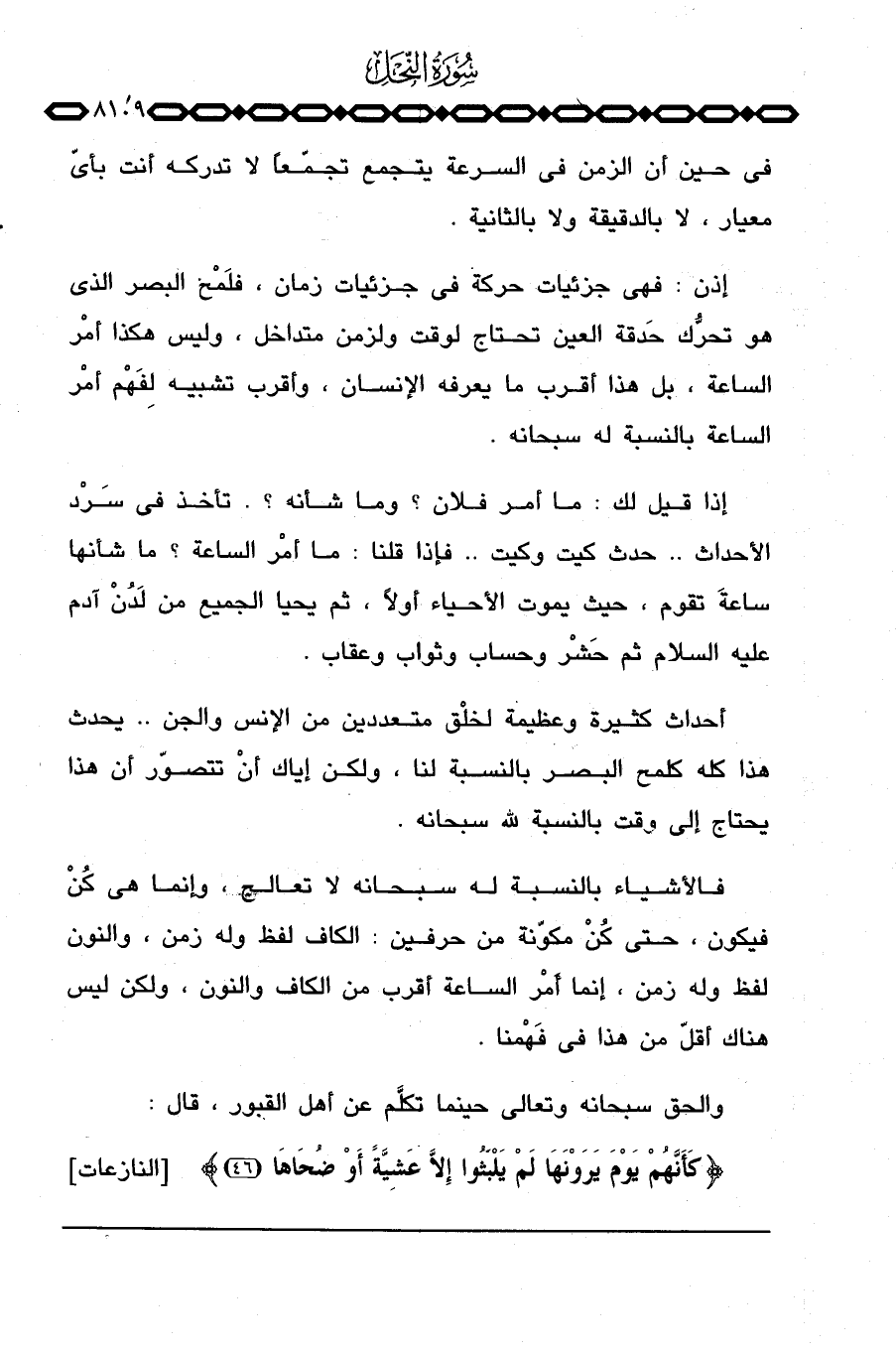 فالأشياء بالنسبة له سبحانه لا تعالج، وإنما هي كُنْ فيكون، حتى كُنْ مكوّنة من حرفين: الكاف لفظ وله زمن، والنون لفظ وله زمن، إنما أَمْر الساعة أقرب من الكاف والنون، ولكن ليس هناك أقلّ من هذا في فَهْمنا.