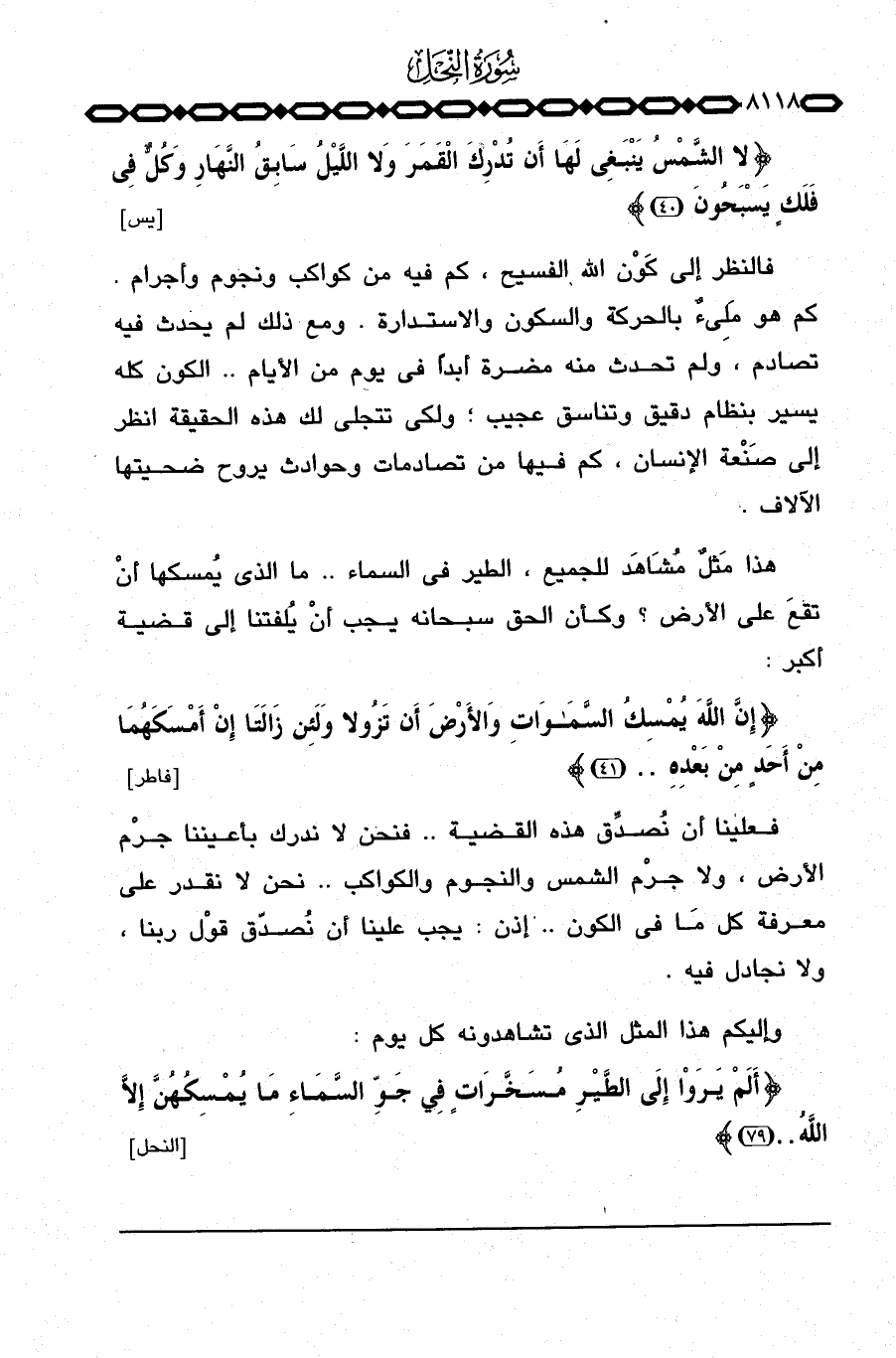 {لاَ الشمس يَنبَغِي لَهَآ أَن تدْرِكَ القمر وَلاَ اليل سَابِقُ النهار وَكُلٌّ فِي فَلَكٍ يَسْبَحُونَ} [يس: 40] .