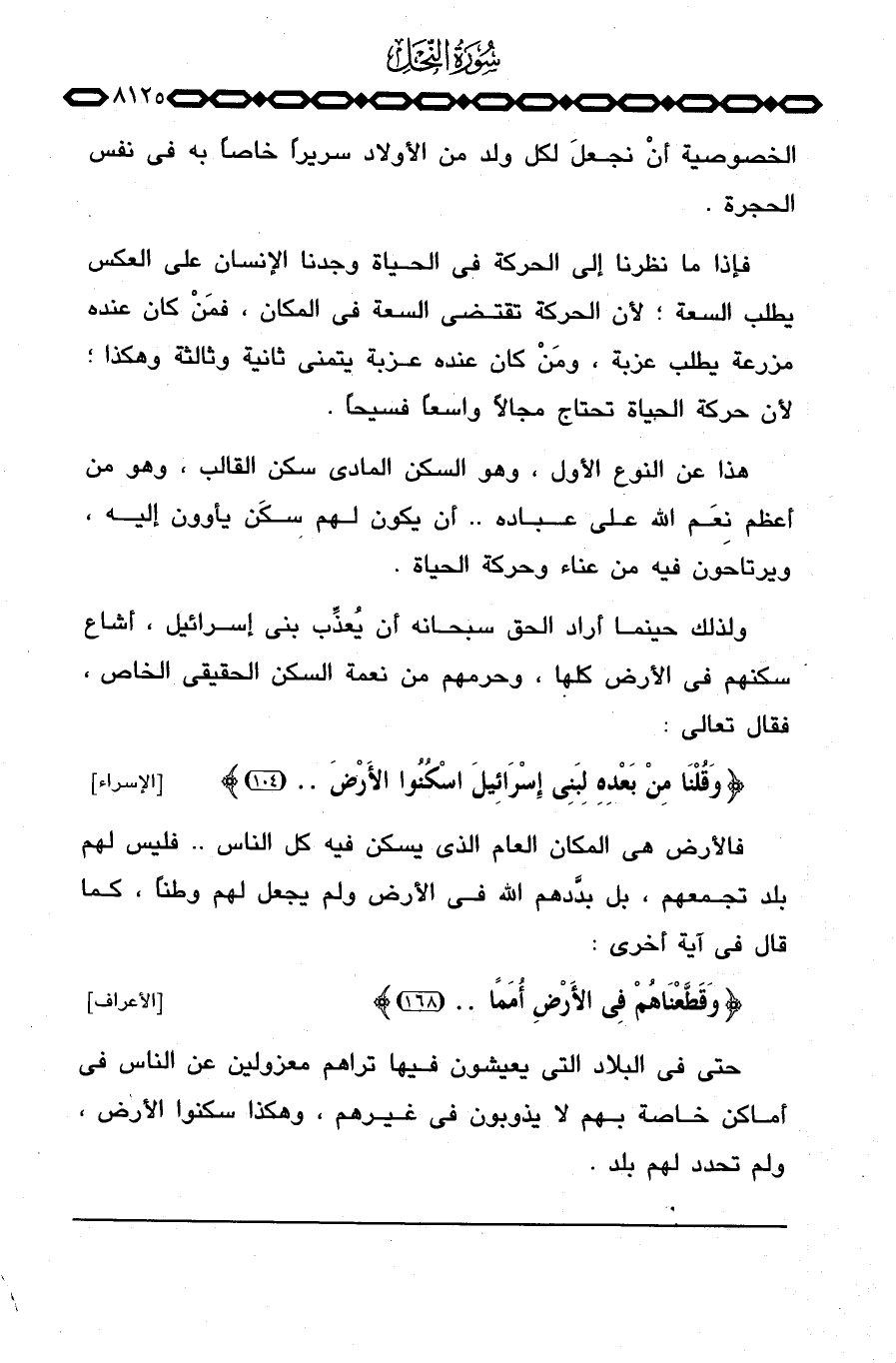 ولذلك حينما أراد الحق سبحانه أن يُعذِّب بني إسرائيل، أشاع سكنهم في الأرض كلها، وحرمهم من نعمة السكن الحقيقي الخاص، فقال تعالى: {وَقُلْنَا مِن بَعْدِهِ لِبَنِي إِسْرَائِيلَ اسكنوا الأرض ... } [الإسراء: 104] .