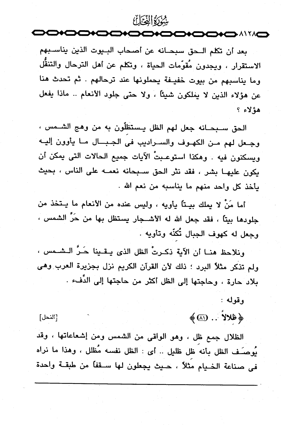 ونلاحظ هنا أن الآية ذكرتْ الظل الذي يقينا حَرَّ الشمس، ولم تذكر مثلاً البرد؛ ذلك لأن القرآن الكريم نزل بجزيرة العرب وهي بلاد حارة، وحاجتها إلى الظل أكثر من حاجتها إلى الدِّفء.
