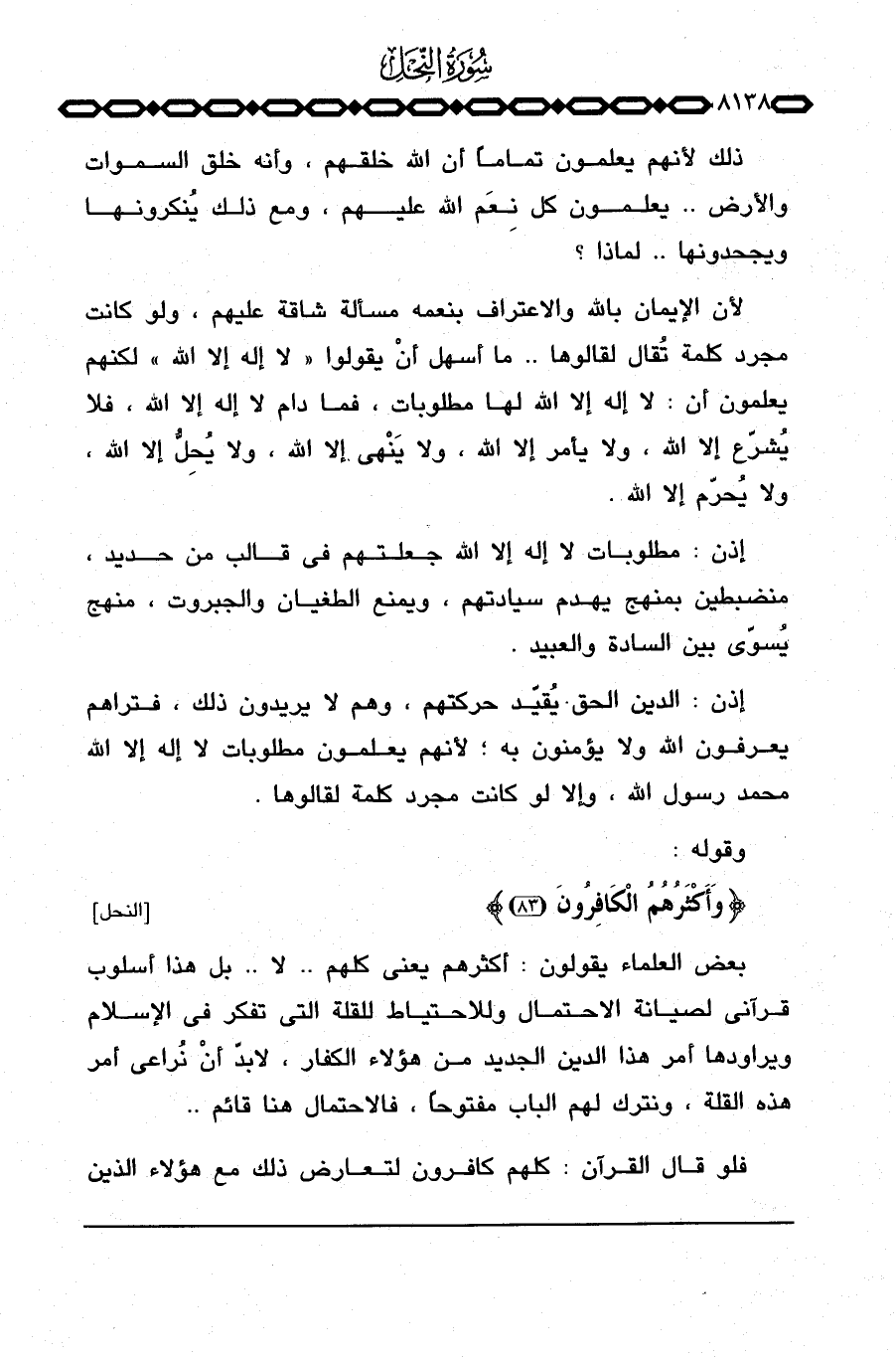 بعض العلماء يقولون: أكثرهم يعني كلهم. . لا. . بل هذا أسلوب قرآني لصيانة الاحتمال وللاحتياط للقلة التي تفكر في الإسلام ويراودها أمر هذا الدين الجديد من هؤلاء الكفار، لا بُدَّ أنْ نُراعي أمر هذه القلة، ونترك لهم الباب مفتوحاً، فالاحتمال هنا قائم. .