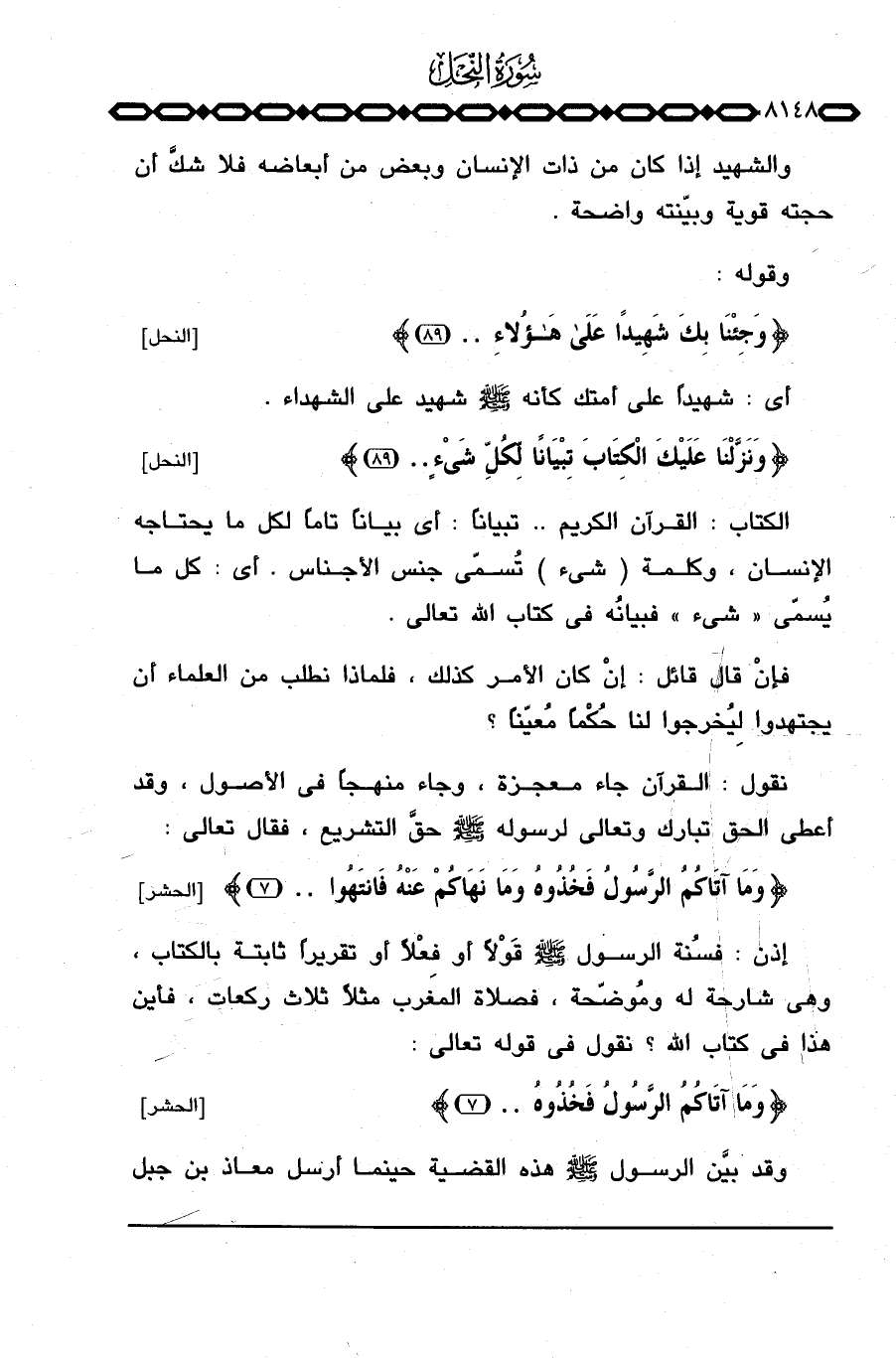 الكتاب: القرآن الكريم. . تبياناً: أي بياناً تاماً لكل ما يحتاجه الإنسان، وكلمة (شيء) تُسمّى جنس الأجناس. أي: كل ما يُسمّى «شيء» فبيانُه في كتاب الله تعالى.