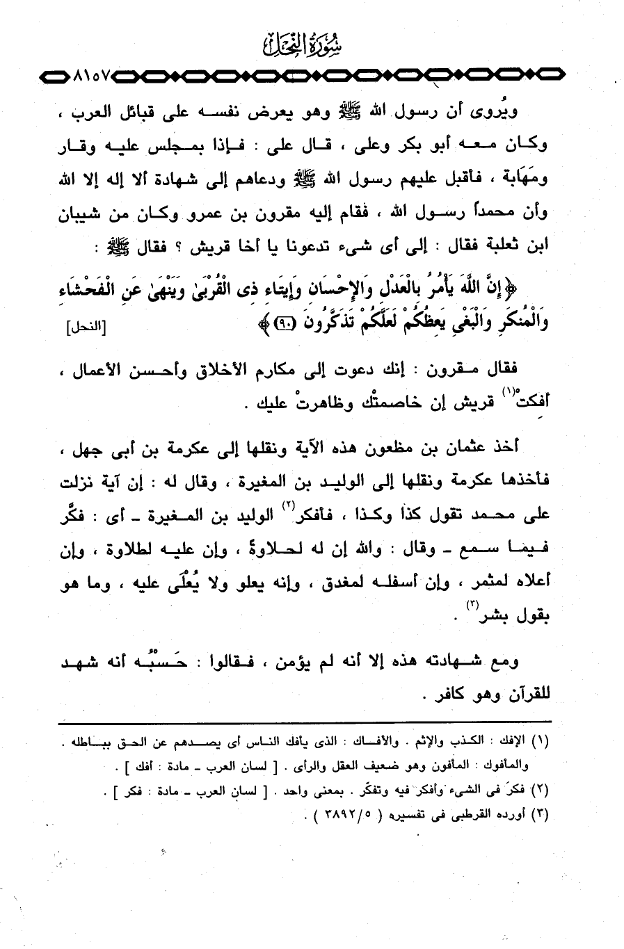 أخذ عثمان بن مظعون هذه الآية ونقلها إلى عكرمة بن أبي جهل، فأخذها عكرمة ونقلها إلى الوليد بن المغيرة، وقال له: إن آية نزلت على محمد تقول كذا وكذا، فأفكر الوليد بن المغيرة أي: فكَّر فيما سمع وقال: والله إن له لحلاوةً، وإن عليه لطلاوة، وإن أعلاه لمثمر، وإن أسفله لمغدق، وأنه يعلو ولا يُعْلَى عليه، وما هو بقول بشر.