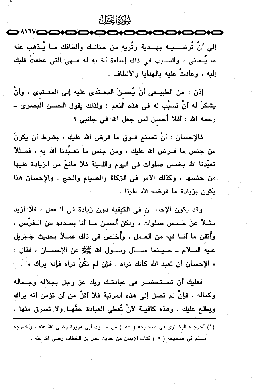 وقد يكون الإحسان في الكيفية دون زيادة في العمل، فلا أزيد مثلاً عن خمس صلوات، ولكن أُحسِن ما أنا بصدده من الفرْض، وأُتقِن ما أنا فيه من العمل، وأُخلِص في ذلك عملاً بحديث جبريل عليه السلام حينما سأل رسول الله صَلَّى اللَّهُ عَلَيْهِ وَسَلَّم َ عن الإحسان، فقال: «الإحسان أن تعبد الله كأنك تراه، فإن لم تكُنْ تراه فإنه يراك» .