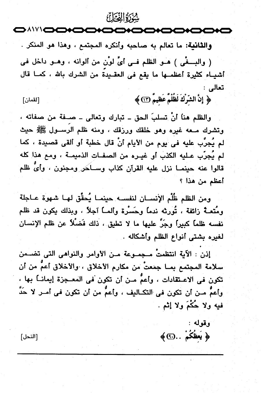 والظلم هنا أنْ تسلبَ الحق تبارك وتعالى صِفة من صفاته، وتشرك معه غيره وهو خلقك ورزقك، ومنه ظلم الرسول صَلَّى اللَّهُ عَلَيْهِ وَسَلَّم َ حيث لم يُجرَّب عليه في يوم من الأيام أنْ قال خطبة أو ألقى قصيدة، كما لم يُجرِّب عليه الكذب أو غيره من الصفات الذميمة، ومع هذا كله قالوا عنه حينما نزل عليه القرآن كذاب وساحر ومجنون، وأيُّ ظلم أعظم من هذا؟