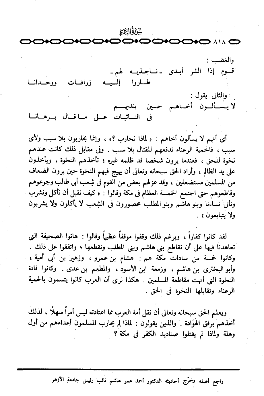 أي أنهم لا يسألون أخاهم: «لماذا نحارب؟» ، وإنما يحاربون بلا سبب ولأي سبب، فالحمية الرعناء تدفعهم للقتال بلا سبب. وفي مقابل ذلك كانت عندهم نخوة للحق، فعندما يرون شخصا قد ظلمه غيره؛ تأخذهم النخوة، ويأخذون على يد الظالم، وأراد الحق سبحانه وتعالى أن يهيج فيهم النخوة حين يرون الضعاف من المسلمين مستضعفين، وقد عزلهم بعض من القوم في شعب أبي طالب وجوعوهم وقاطعوهم حتى اجتمع الخمسة العظام في مكة وقالوا: «كيف نقبل أن نأكل ونشرب ونأتي نساءنا وبنو هاشم وبنو المطلب محصورون في الشعب لا يأكلون ولا يشربون ولا يتبايعون» .