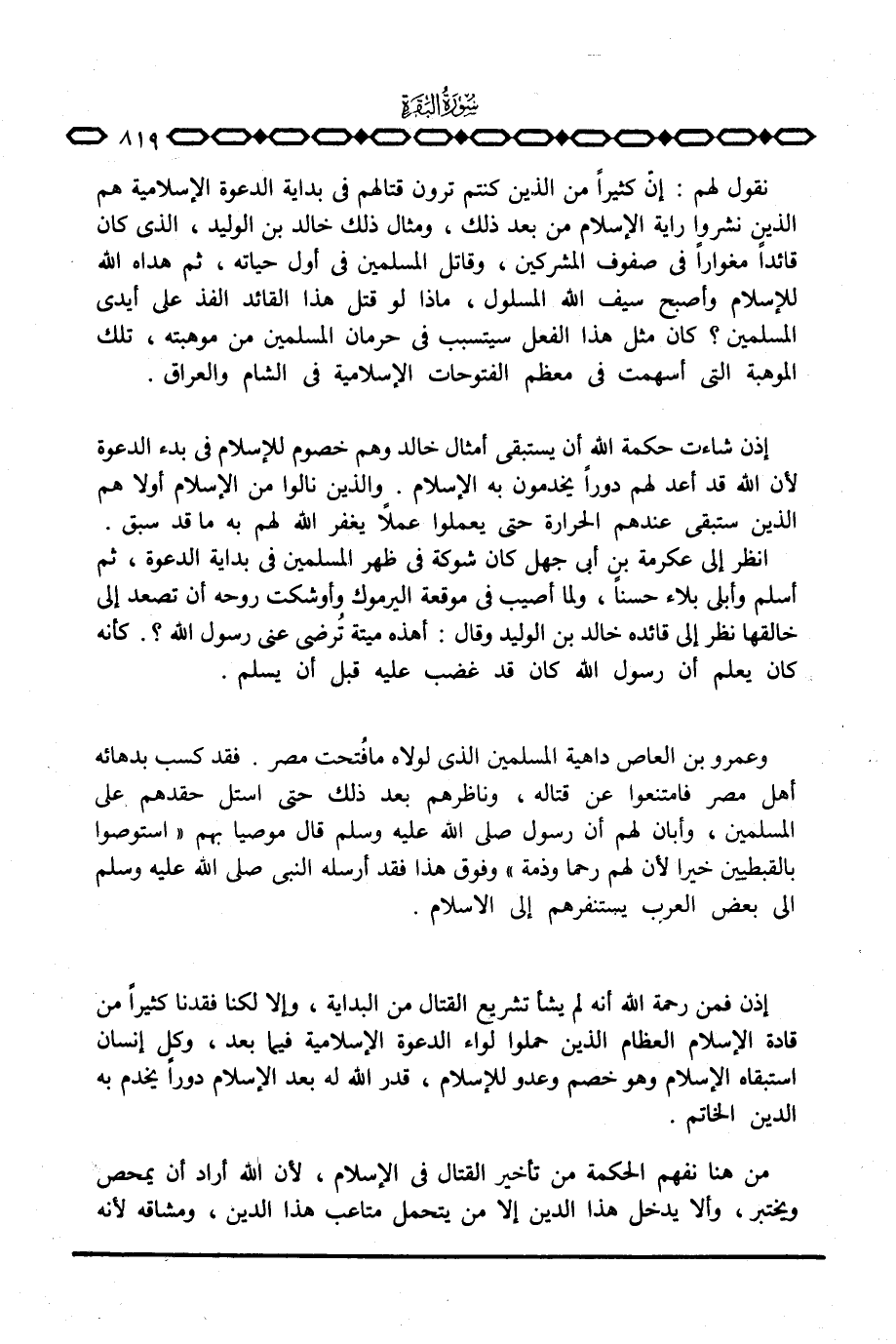 إذن شاءت حكمة الله أن يستبقي أمثال خالد وهم خصوم للإسلام في بدء الدعوة لأن الله قد أعد لهم دوراً يخدمون به الإسلام. والذين نالوا من الإسلام أولا هم الذين ستبقى عندهم الحرارة حتى يعملوا عملاً يغفر الله لهم به ما قد سبق.