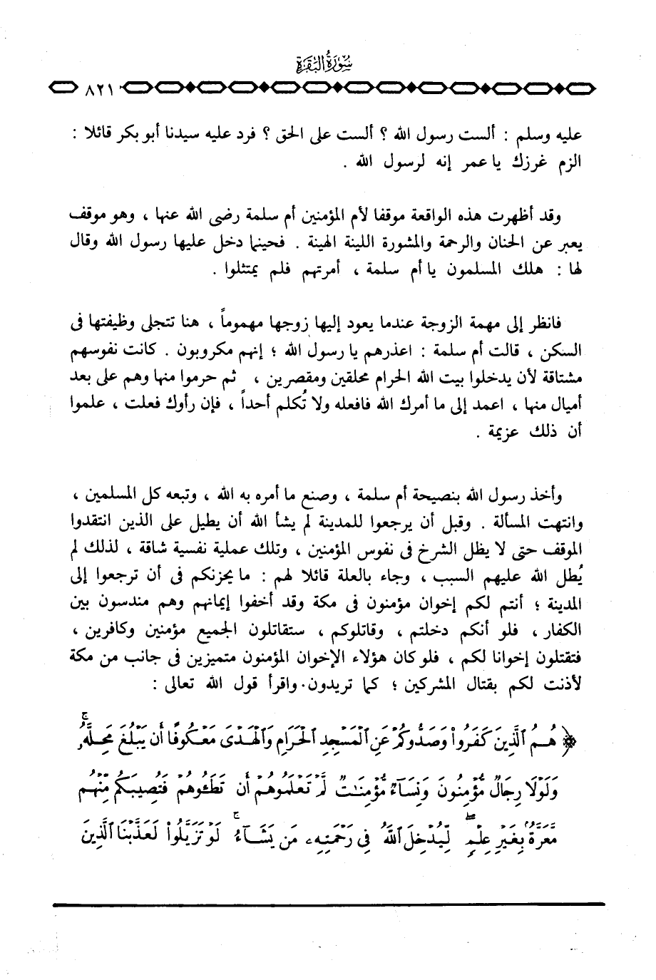 وأخذ رسول الله بنصيحة أم سلمة، وصنع ما أمره به الله، وتبعه كل المسلمين، وانتهت المسألة. وقبل أن يرجعوا للمدينة لم يشأ الله أن يطيل على الذين انتقدوا الموقف حتى لا يظل الشرخ في نفوس المؤمنين، وتلك عملية نفسية شاقة، لذلك لم يُطل الله عليهم السبب، وجاء بالعلة قائلا لهم: ما يحزنكم في أن ترجعوا إلى المدينة؛ أنتم لكم إخوان مؤمنون في مكة وقد أخفوا إيمانهم وهم مندسون بين الكفار، فلو أنكم دخلتم، وقاتلوكم، ستقاتلون الجميع مؤمنين وكافرين، فتقتلون إخوانا لكم، فلو كان هؤلاء الإخوان المؤمنون متميزين في جانب من مكة لأذنت لكم بقتال المشركين؛ كما تريدون. واقرأ قول الله تعالى: {هُمُ الذين كَفَرُواْ وَصَدُّوكُمْ عَنِ المسجد الحرام والهدي مَعْكُوفاً أَن يَبْلُغَ مَحِلَّهُ وَلَوْلاَ رِجَالٌ مُّؤْمِنُونَ وَنِسَآءٌ مُّؤْمِنَاتٌ لَّمْ تَعْلَمُوهُمْ أَن تَطَئُوهُمْ فَتُصِيبَكُمْ مِّنْهُمْ مَّعَرَّةٌ بِغَيْرِ عِلْمٍ لِّيُدْخِلَ الله فِي رَحْمَتِهِ مَن يَشَآءُ لَوْ تَزَيَّلُواْ لَعَذَّبْنَا الذين كَفَرُواْ مِنْهُمْ عَذَاباً أَلِيماً} [الفتح: 25]