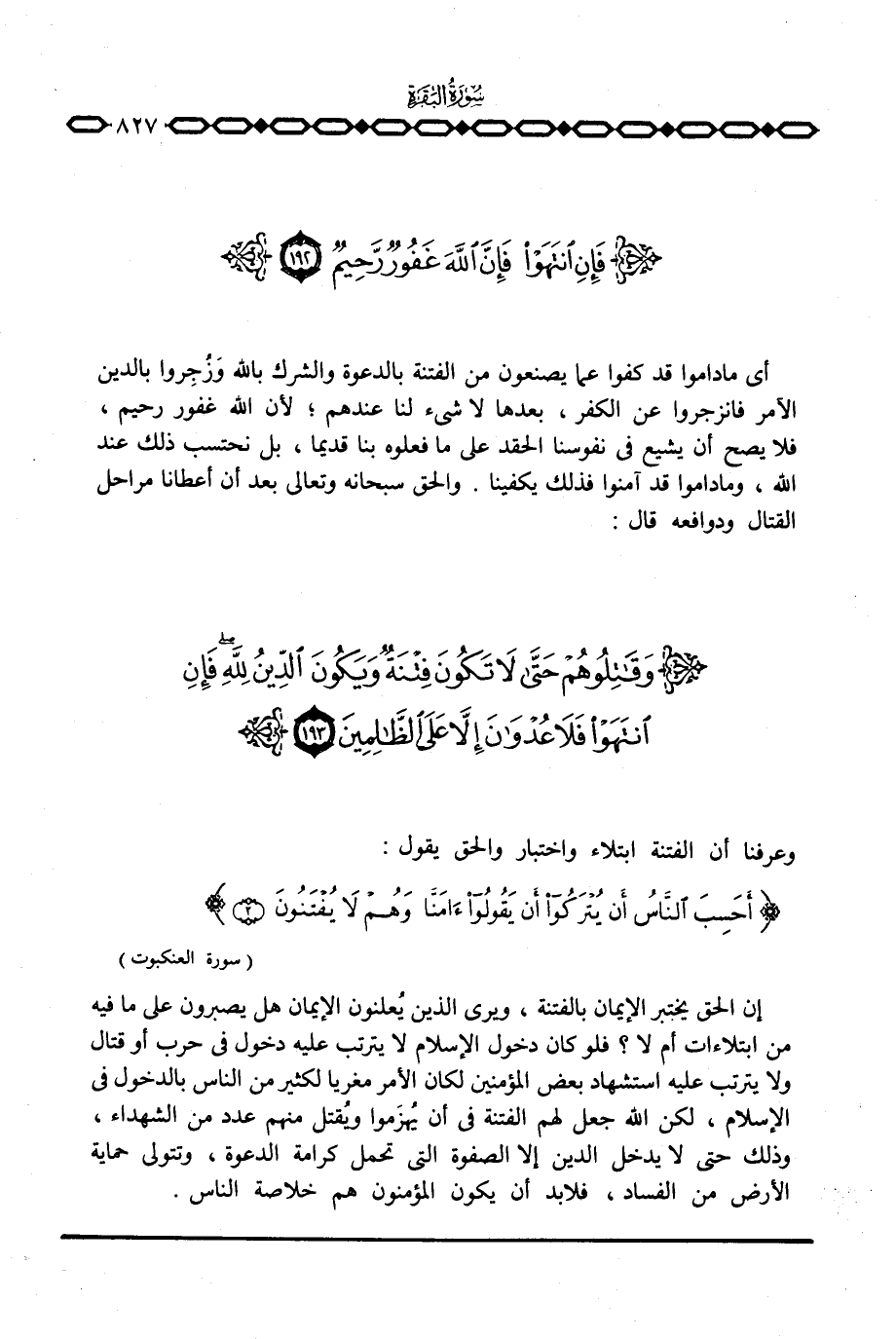 لذلك قال سبحانه: {وَقَاتِلُوهُمْ حتى لاَ تَكُونَ فِتْنَةٌ} . معنى أن يكون الدين لله، أي تخرجوهم من ديانة أنفسهم أو من الديانات التي فرضها الطغيان عليهم، وعندما نأخذهم من ديانات الطغيان، ومن الديانات التي زينها الناس إلى ديانات الخالق فهذه مسألة حسن بالنسبة لهم، وتلك مهمة سامية. كأنك بهذه