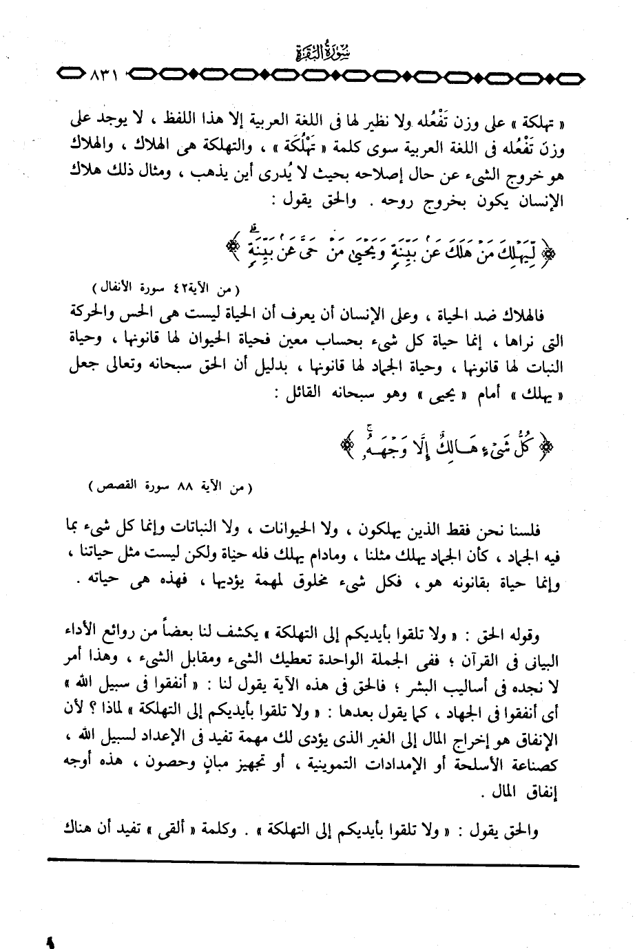 وقوله الحق: {وَلاَ تُلْقُواْ بِأَيْدِيكُمْ إِلَى التهلكة} يكشف لنا بعضاً من روائع الأداء البياني في القرآن؛ ففي الجملة الواحدة تعطيك الشيء ومقابل الشيء، وهذا أمر لا نجده في أساليب البشر؛ فالحق في هذه الآية يقول لنا: {وَأَنْفِقُواْ فِي سَبِيلِ الله} أي أنفقوا في الجهاد، كما يقول بعدها: {وَلاَ تُلْقُواْ بِأَيْدِيكُمْ إِلَى التهلكة} لماذا؟ لأن الإنفاق هو إخراج المال إلى الغير الذي يؤدي لك مهمة تفيد في الإعداد لسبيل الله، كصناعة الأسلحة أو الإمدادات التموينية، أو تجهيز مبانٍ وحصون، هذه أوجه أنفاق المال.