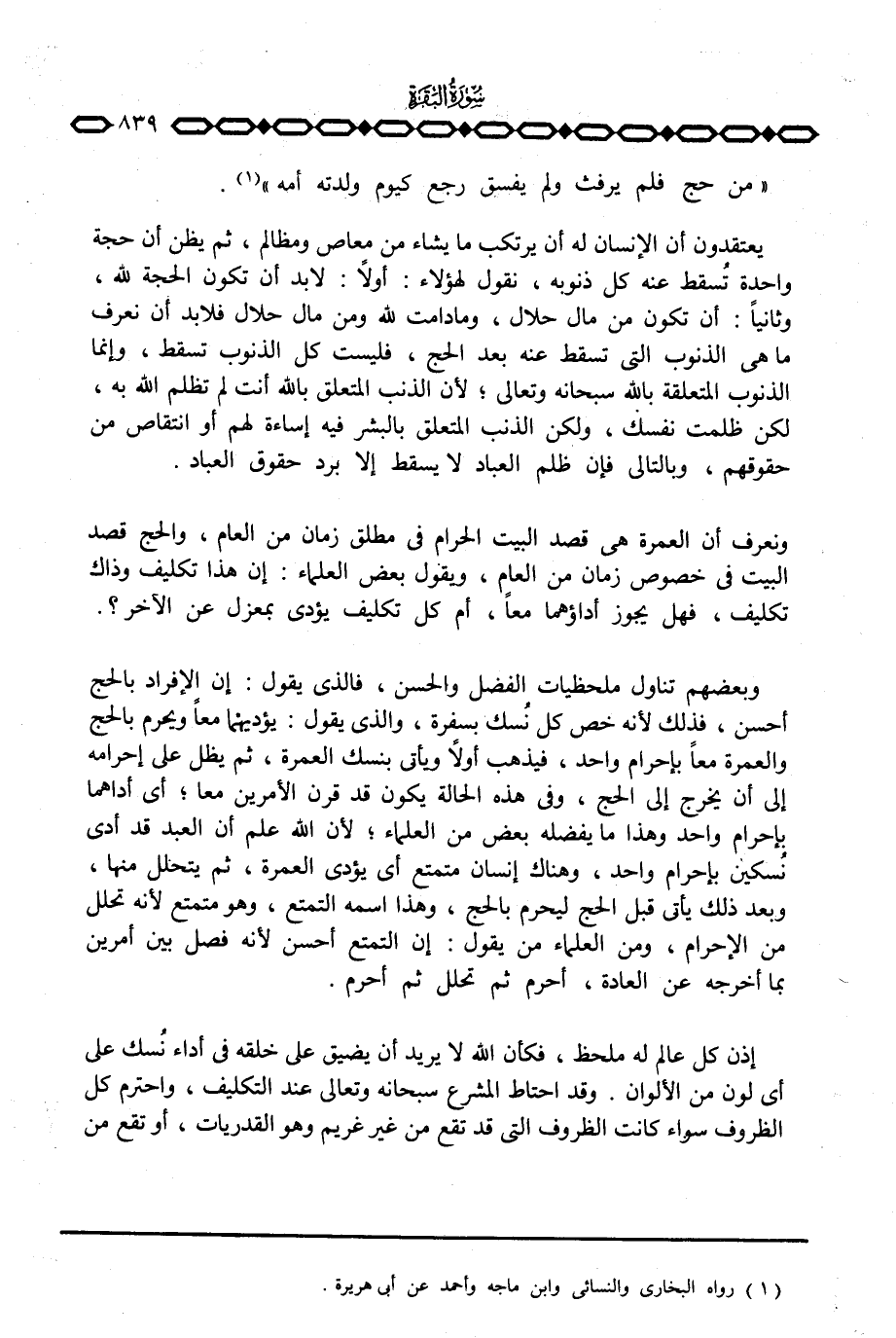 وبعضهم تناول ملحظيات الفضل والحسن، فالذي يقول: إن الإفراد بالحج أحسن، فذلك لأنه خص كل نُسك بسفرة، والذي يقول: يؤديهما معاً ويحرم بالحج والعمرة معاً بإحرام واحد، فيذهب أولاً ويأتي بنسك العمرة، ثم يظل على إحرامه إلى أن يخرج إلى الحج، وفي هذه الحالة يكون قد قرن الأمرين معا؛ أي أداهما بإحرام واحد وهذا ما يفضله بعض من العلماء؛ لأن الله علم أن العبد قد أدى نسكين بإحرام واحد، وهناك إنسان متمتع أي يؤدي العمرة، ثم يتحلل منها، وبعد ذلك يأتي قبل الحج ليحرم بالحج، وهذا اسمه التمتع، وهو متمتع لأنه تحلل من الإحرام، ومن العلماء من يقول: إن التمتع أحسن لأنه فصل بين أمرين بما أخرجه عن العادة، أحرم ثم تحلل ثم أحرم.