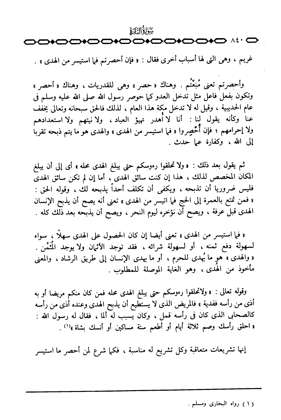 وأحصرتم تعني مُنعْتُم. وهناك «حصر» وهي للقدريات، وهناك «أحصر» وتكون بفعل فاعل مثل تدخل العدو كما حوصر رسول الله صَلَّى اللَّهُ عَلَيْهِ وَسَلَّم َ في عام الحديبية، وقيل له لا تدخل مكة هذا العام، لذلك فالحق سبحانه وتعالى يخفف عنا وكأنه يقول لنا: أنا لا أهدر تهيؤ العباد، ولا نيتهم ولا استعدادهم ولا إحرامهم؛ فإن أُحصِروا {فَمَا استيسر مِنَ الهدي} والهدى هو ما يتم ذبحه تقربا إلى الله، وكفارة عما حَدث.