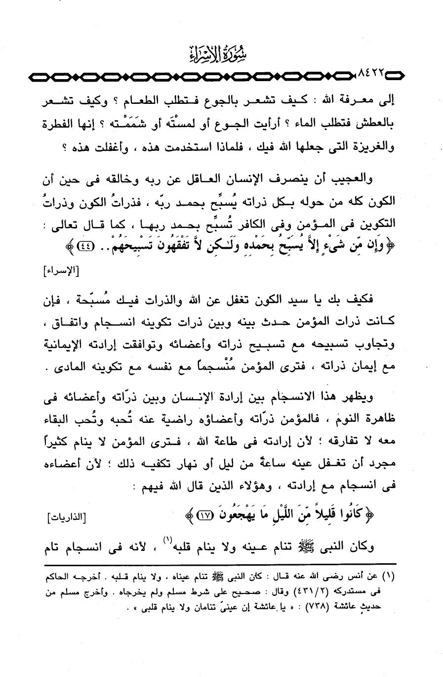 وكان النبي صَلَّى اللَّهُ عَلَيْهِ وَسَلَّم َ تنام عينه ولا ينام قلبه، لأنه في انسجام تام مع إرادته صَلَّى اللَّهُ عَلَيْهِ وَسَلَّم َ.