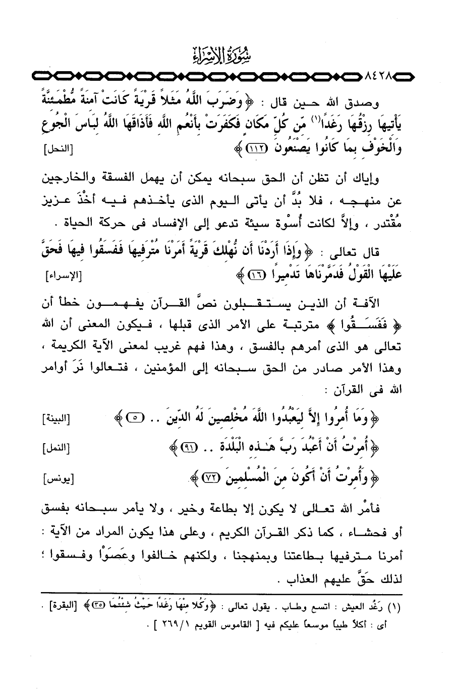 قال تعالى: {وَإِذَآ أَرَدْنَآ أَن نُّهْلِكَ قَرْيَةً أَمَرْنَا مُتْرَفِيهَا فَفَسَقُواْ فِيهَا فَحَقَّ عَلَيْهَا القول فَدَمَّرْنَاهَا تَدْمِيراً} [الإسراء: 16]