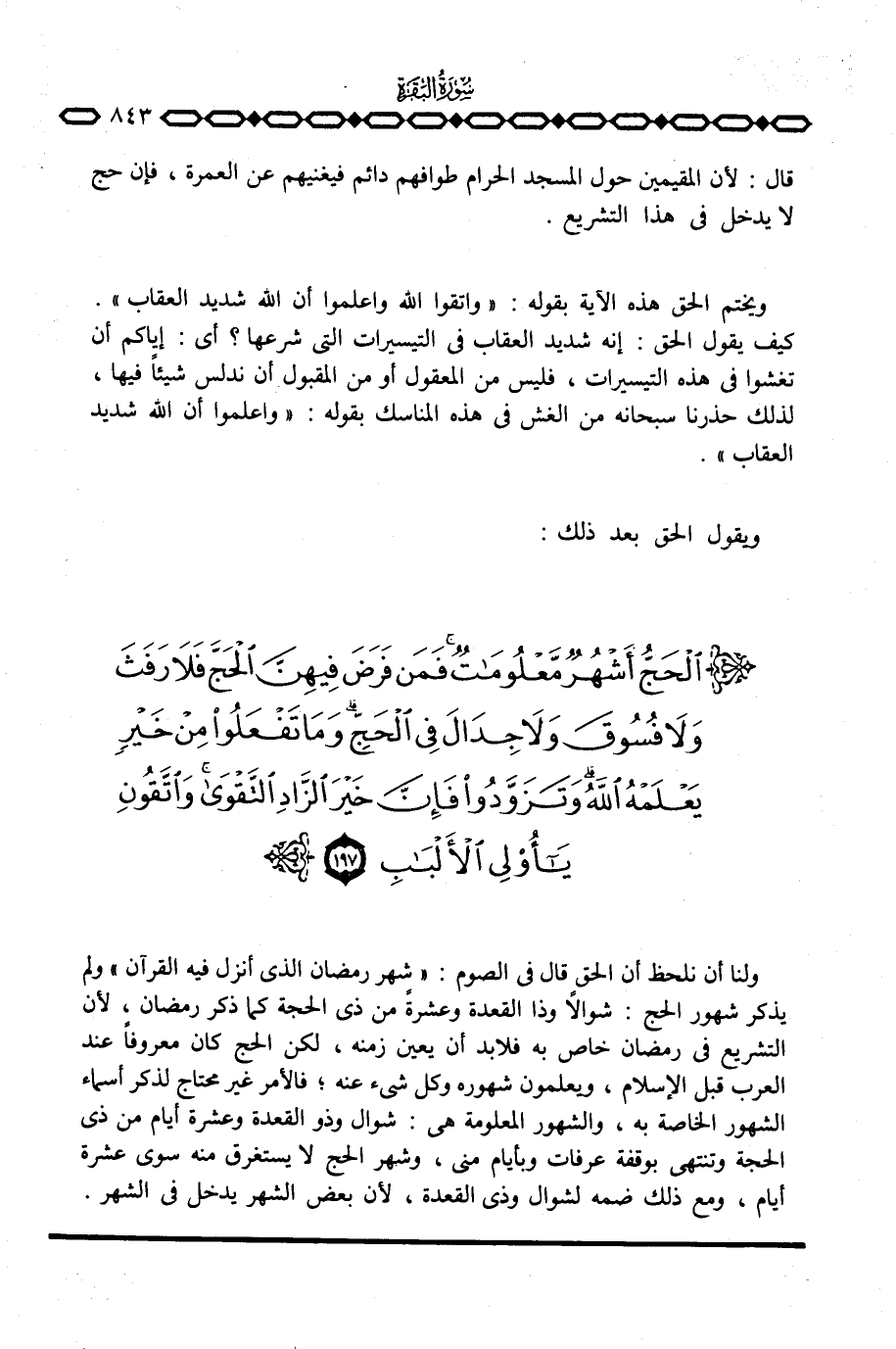 ولنا أن نلحظ أن الحق قال في الصوم: {شَهْرُ رَمَضَانَ الذي أُنْزِلَ فِيهِ القرآن} ولم يذكر شهور الحج: شوالاً وذا القعدة وعشرة من ذي الحجة كما ذكر رمضان، لأن التشريع في رمضان خاص به فلا بد أن يعين زمنه، لكن الحج كان معروفاً عند العرب قبل الإسلام، ويعلمون شهوره وكل شيء عنه؛ فالأمر غير محتاج لذكر أسماء الشهور الخاصة به، والشهور المعلومة هي: شوال وذو القعدة وعشرة أيام من ذي الحجة وتنتهي بوقفة عرفات وبأيام منى، وشهر الحج لا يستغرق منه سوى عشرة أيام، ومع ذلك ضمه لشوال وذي القعدة، لأن بعض الشهر يدخل في الشهر.