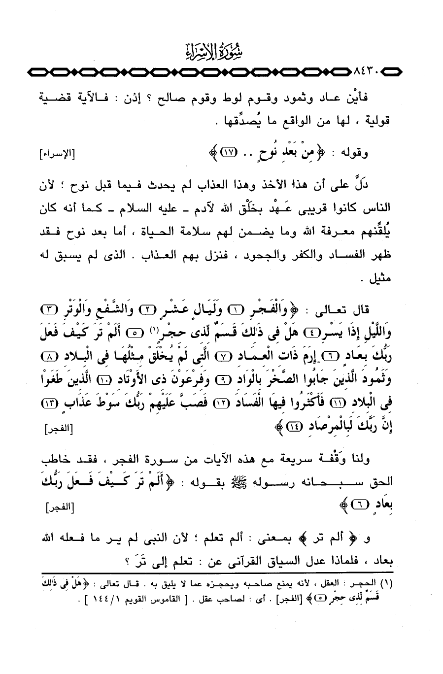 قال تعالى: {والفجر وَلَيالٍ عَشْرٍ والشفع والوتر واليل إِذَا يَسْرِ هَلْ فِي ذَلِكَ قَسَمٌ لِّذِى حِجْرٍ أَلَمْ تَرَ كَيْفَ فَعَلَ رَبُّكَ بِعَادٍ إِرَمَ ذَاتِ العماد التي لَمْ يُخْلَقْ مِثْلُهَا فِي البلاد وَثَمُودَ الذين جَابُواْ الصخر بالواد وَفِرْعَوْنَ ذِى الأوتاد الذين طَغَوْاْ فِي البلاد فَأَكْثَرُواْ فِيهَا الفساد فَصَبَّ عَلَيْهِمْ رَبُّكَ سَوْطَ عَذَابٍ إِنَّ رَبَّكَ لبالمرصاد} [الفجر: 1 - 14]