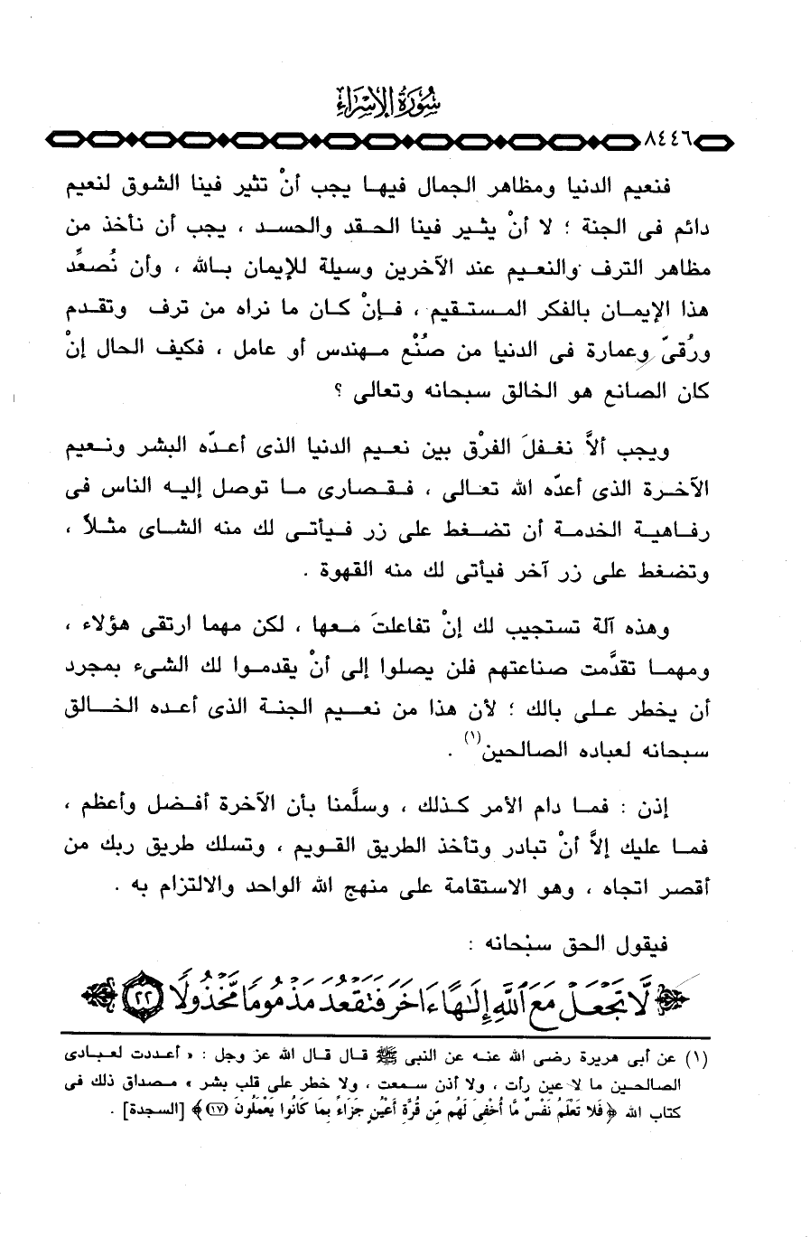 ويجب ألاًّ نغفلَ الفرْق بين نعيم الدنيا الذي أعدّه البشر ونعيم الآخرة الذي أعدّه الله تعالى، فقصارى ما توصل إليه الناس في رفاهية الخدمة أن تضغط على زر فيأتي لك منه الشاي مثلاً، وتضغط على زر آخر فيأتي لك منه القهوة.