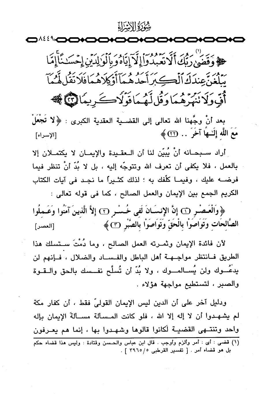 {وقضى رَبُّكَ أَلاَّ تعبدوا إِلاَّ إِيَّاهُ وبالوالدين إِحْسَاناً ... } .