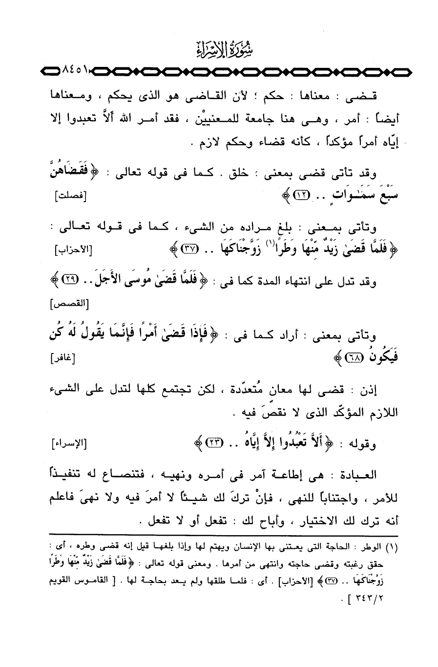قضى: معناها: حكم؛ لأن القاضي هو الذي يحكم، ومعناها أيضاً: أمر، وهي هنا جامعة للمعنييْن، فقد أمر الله ألاَّ تعبدوا إلا إيّاه أمراً مؤكداً، كأنه قضاء وحكم لازم.