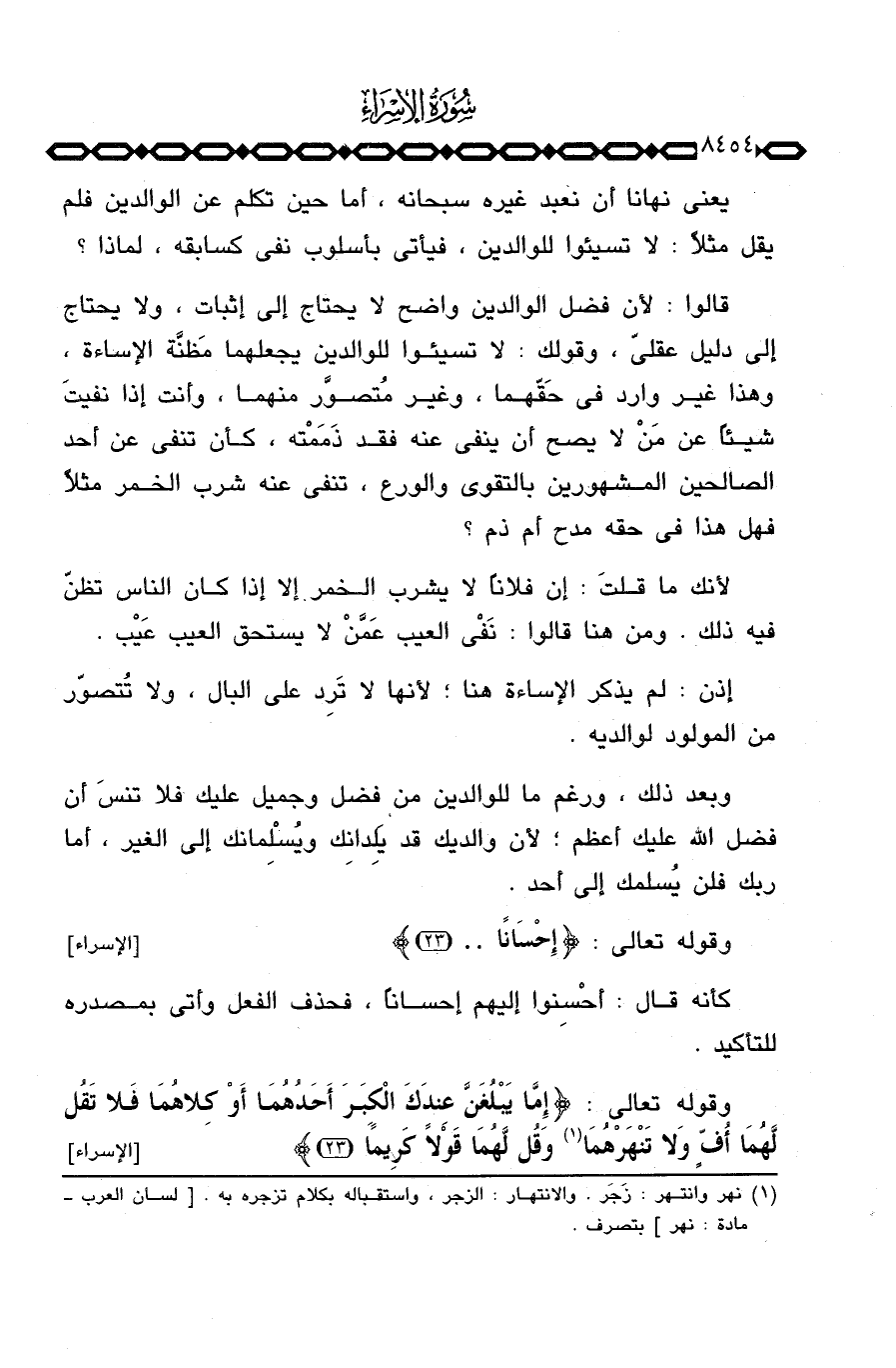 يعني نهانا أن نعبد غيره سبحانه، أما حين تكلم عن الوالدين فلم يقل مثلاً: لا تسيئوا للوالدين، فيأتي بأسلوب نفي كسابقه، لماذا؟
