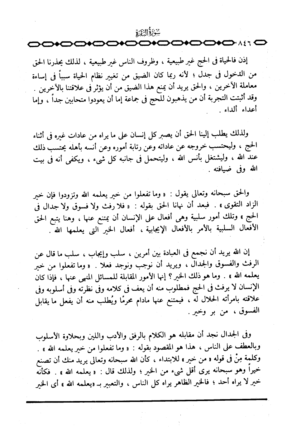 ولذلك يطلب إلينا الحق أن يصبر كل إنسان على ما يراه من عادات غيره في أثناء الحج، وليحتسب خروجه عن عاداته وعن رتابة أموره وعن أنسه بأهله يحتسب ذلك عند الله، وليشتغل بأنس الله، وليتحمل في جانبه كل شيء، ويكفي أنه في بيت الله وفي ضيافته.