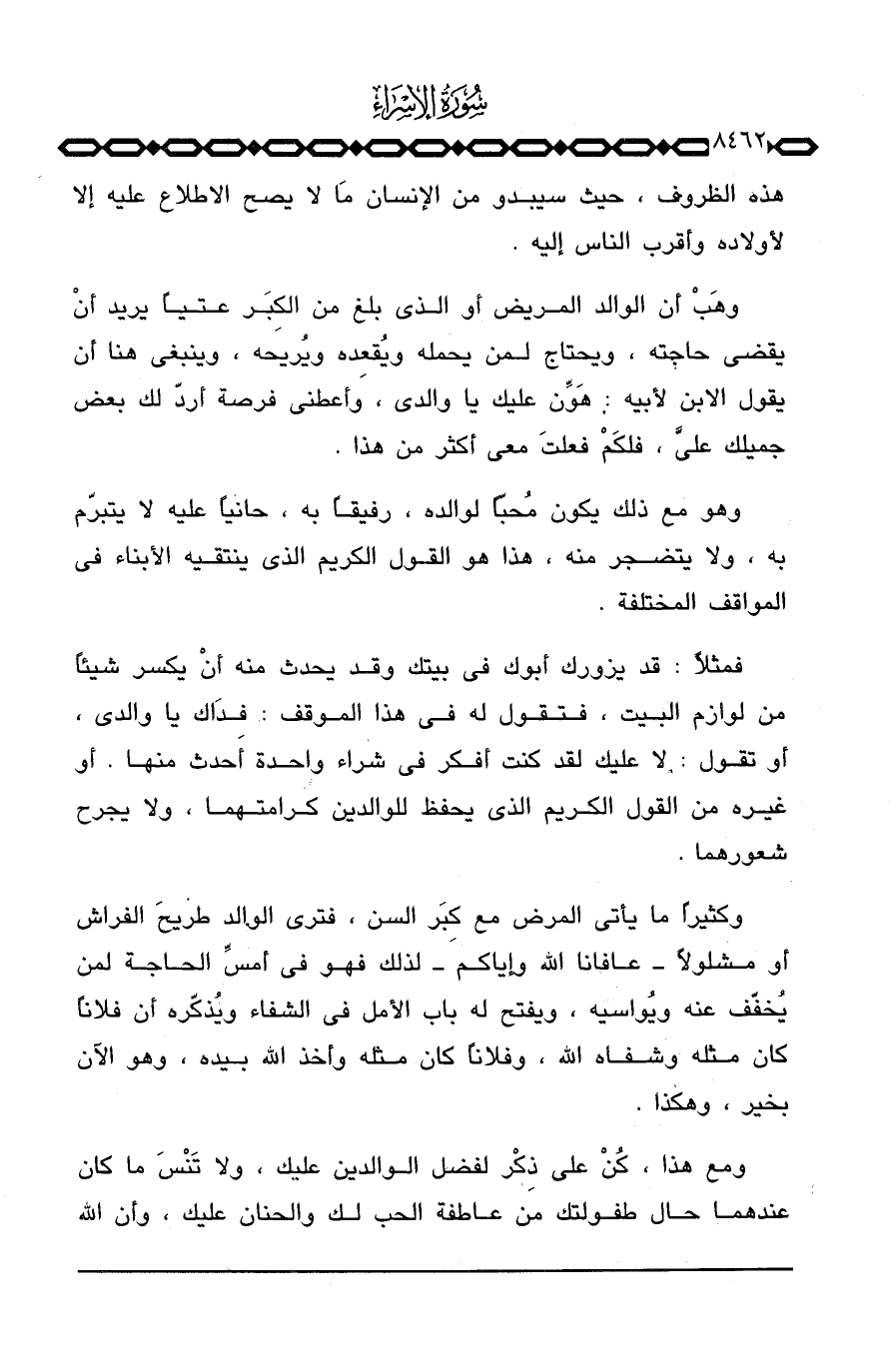 وهو مع ذلك يكون مُحبّاً لوالده، رفيقاً به، حانياً عليه لا يتبرّم به، ولا يتضجر منه، هذا هو القول الكريم الذي ينتقيه الأبناء في المواقف المختلفة.
