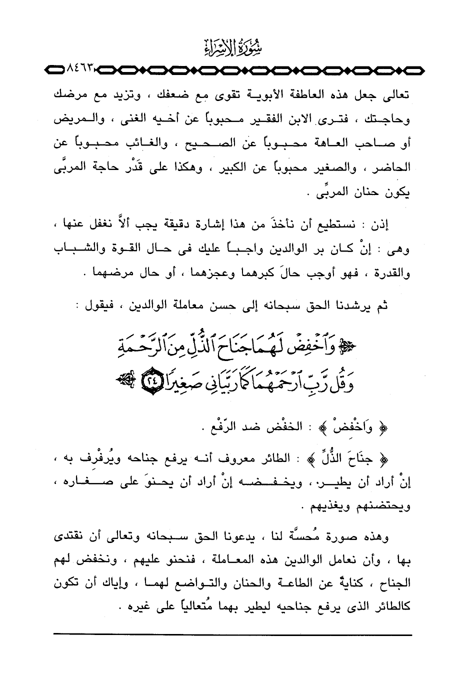 {جَنَاحَ الذل} : الطائر معروف أنه يرفع جناحه ويُرفْرِف به، إنْ أراد أن يطير، ويخفضه إنْ أراد أن يحنوَ على صغاره، ويحتضنهم ويغذيهم.