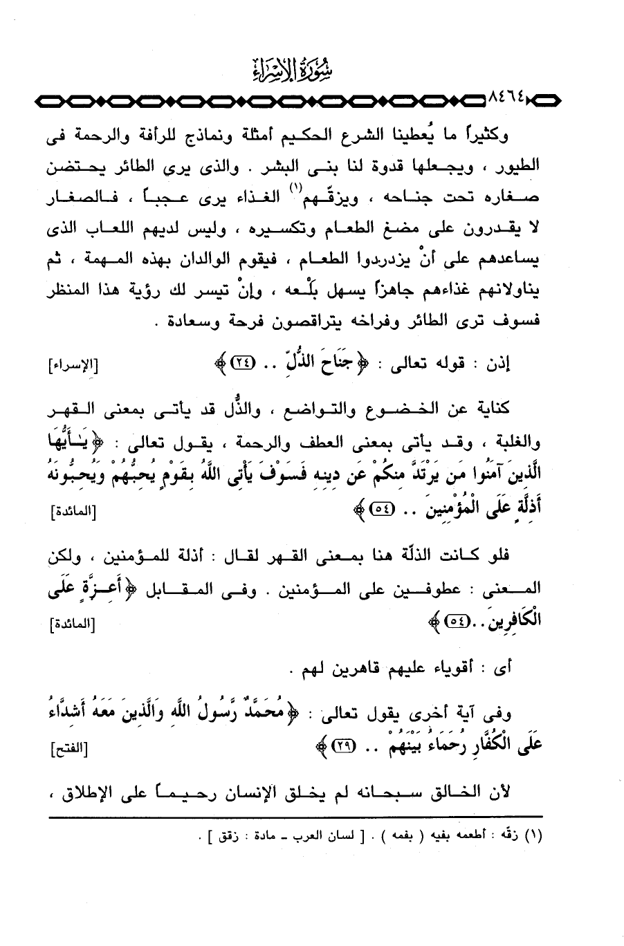 كناية عن الخضوع والتواضع، والذُّل قد يأتي بمعنى القهر والغلبة، وقد يأتي بمعنى العطف والرحمة، يقول تعالى: {ياأيها الذين آمَنُواْ مَن يَرْتَدَّ مِنكُمْ عَن دِينِهِ فَسَوْفَ يَأْتِي الله بِقَوْمٍ يُحِبُّهُمْ وَيُحِبُّونَهُ أَذِلَّةٍ عَلَى المؤمنين. .} [المائدة: 54]