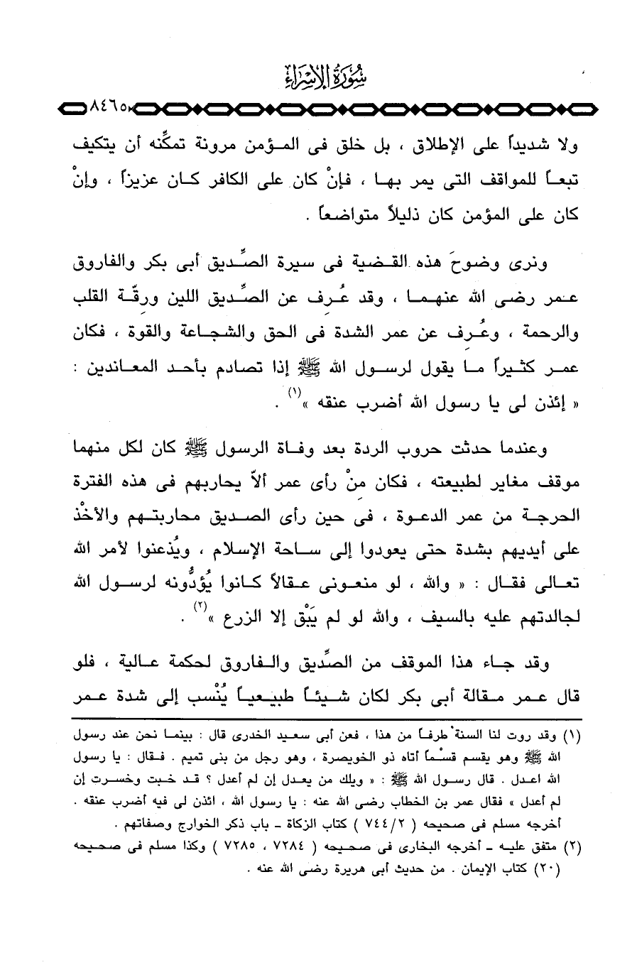 ونرى وضوحَ هذه القضية في سيرة الصِّديق أبي بكر والفاروق عمر رَضِيَ اللَّهُ عَنْهما، وقد عُرِف عن الصِّديق اللين ورِقَّة القلب والرحمة، وعُرِف عن عمر الشدة في الحق والشجاعة والقوة، فكان عمر كثيراً ما يقول لرسول الله صَلَّى اللَّهُ عَلَيْهِ وَسَلَّم َ إذا تصادم بأحد المعاندين: «إئذن لي يا رسول الله أضرب عنقه» .