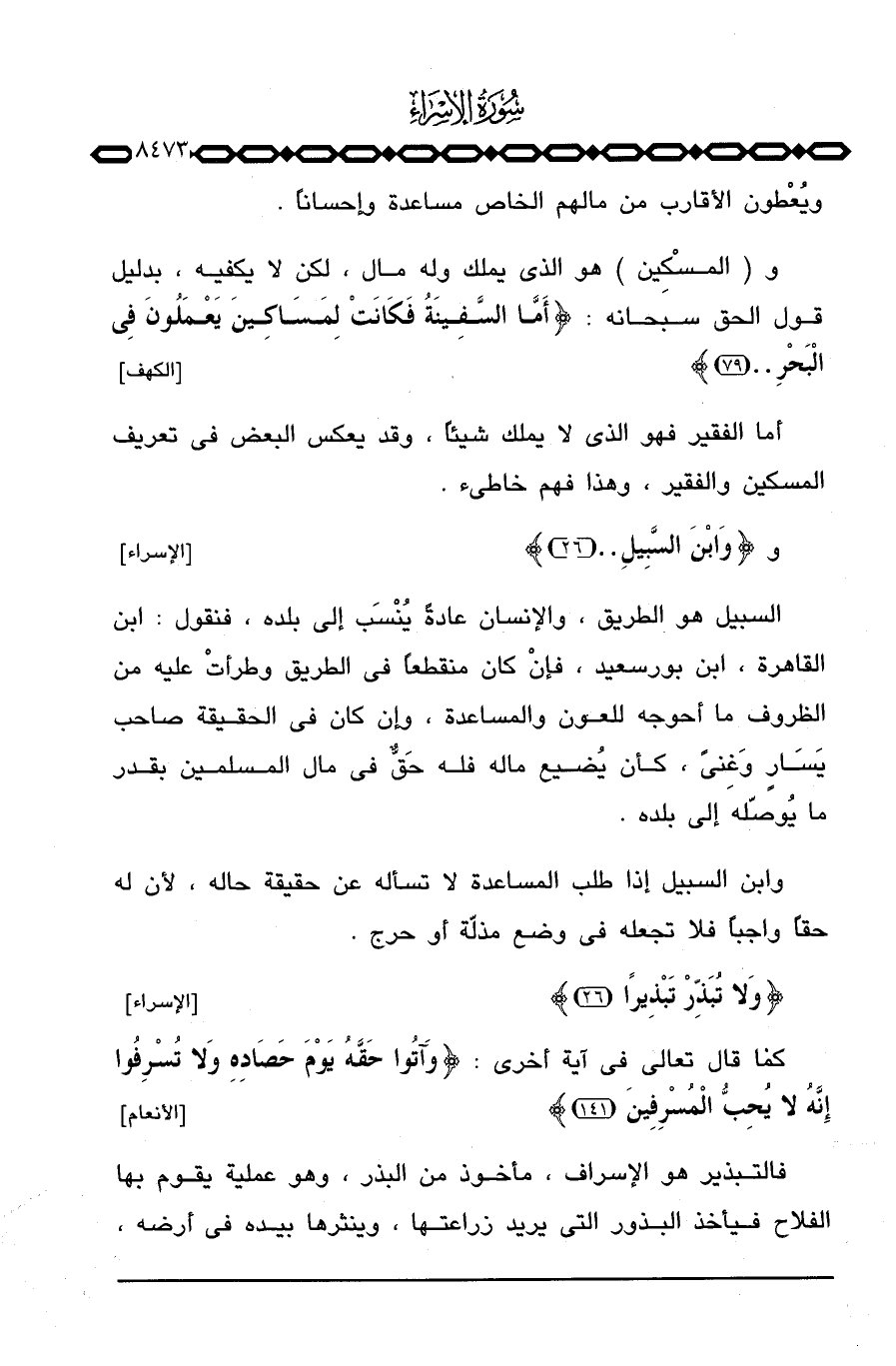 وابن السبيل إذا طلب المساعدة لا تسأله عن حقيقة حاله، لأن له حقاً واجباً فلا تجعله في وضع مذلّة أو حرج.