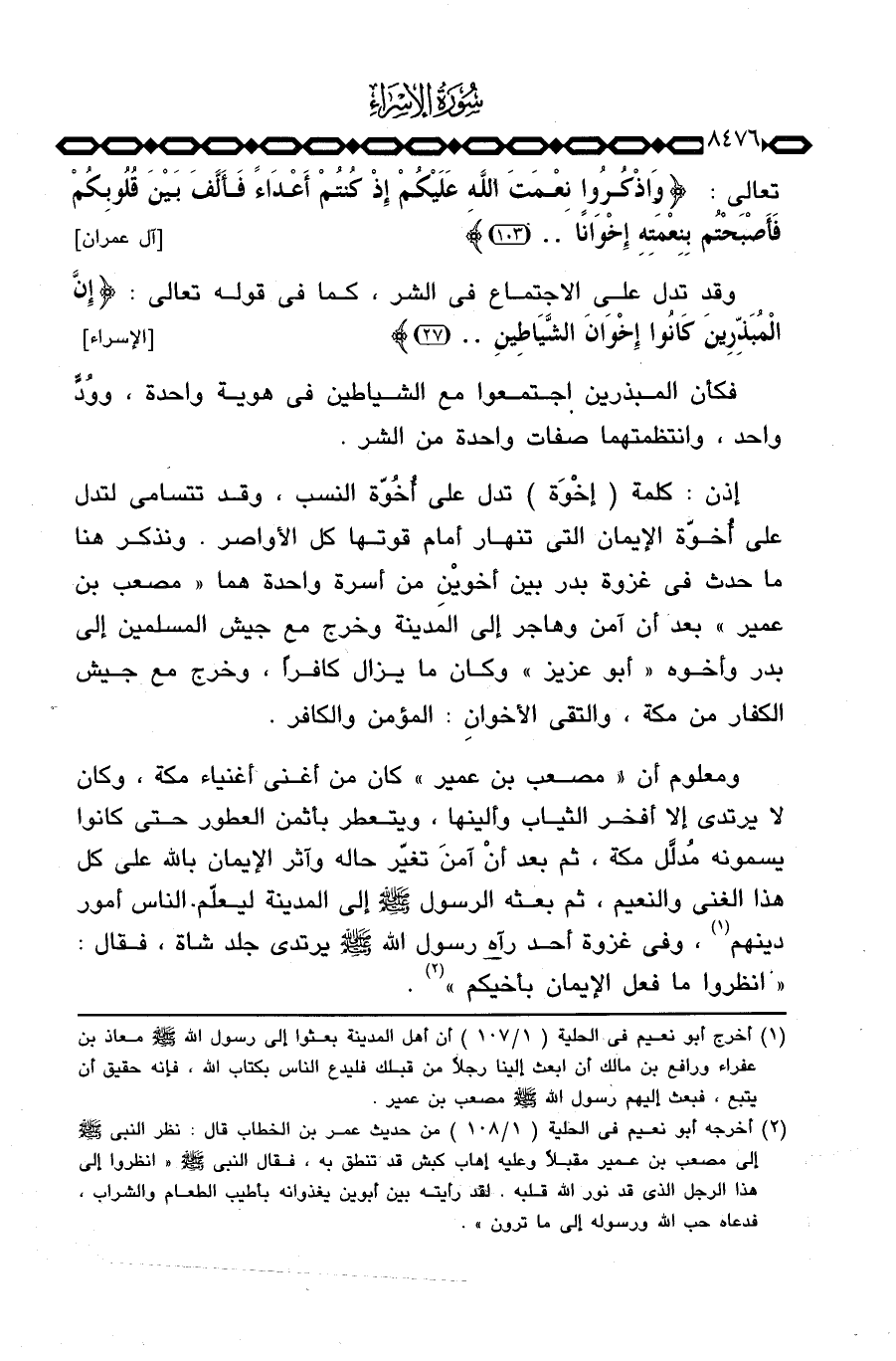 إذن: كلمة (إخْوَة) تدل على أُخُوّة النسب، وقد تتسامى لتدل على أُخوّة الإيمان التي تنهار أمام قوتها كل الأواصر. ونذكر هنا ما حدث في غزوة بدر بين أخويْنِ من أسرة واحدة هما «مصعب بن عمير» بعد أن آمن وهاجر إلى المدينة وخرج مع جيش المسلمين إلى بدر وأخوه «أبو عزيز» وكان ما يزال كافراً، وخرج مع جيش الكفار من مكة، والتقى الأخوان: المؤمن والكافر. «ومعلوم أن» مصعب بن عمير «كان من أغنى أغنياء مكة، وكان لا يرتدي إلا أفخر الثياب وألينها، ويتعطر بأثمن العطور حتى كانوا يسمونه مُدلَّل مكة، ثم بعد أنْ آمنَ تغيّر حاله وآثر الإيمان بالله على كل هذا الغنى والنعيم، ثم بعثه الرسول صَلَّى اللَّهُ عَلَيْهِ وَسَلَّم َ إلى المدينة ليعلّم الناس أمور دينهم، وفي غزوة أحد رآه رسول الله صَلَّى اللَّهُ عَلَيْهِ وَسَلَّم َ يرتدي جلد شاة، فقال:» انظروا ما فعل الإيمان بأخيكم «» .