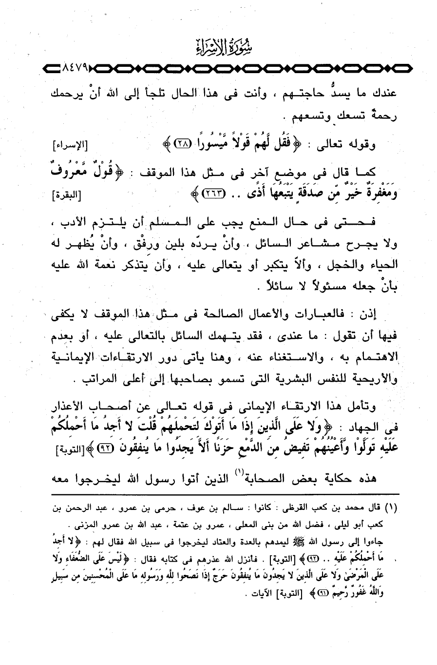 وتأمل هذا الارتقاء الإيماني في قوله تعالى عن أصحاب الأعذار في الجهاد: {وَلاَ عَلَى الذين إِذَا مَآ أَتَوْكَ لِتَحْمِلَهُمْ قُلْتَ لاَ أَجِدُ مَآ أَحْمِلُكُمْ عَلَيْهِ تَوَلَّوْا وَّأَعْيُنُهُمْ تَفِيضُ مِنَ الدمع حَزَناً أَلاَّ يَجِدُواْ مَا يُنْفِقُونَ} [التوبة: 92]